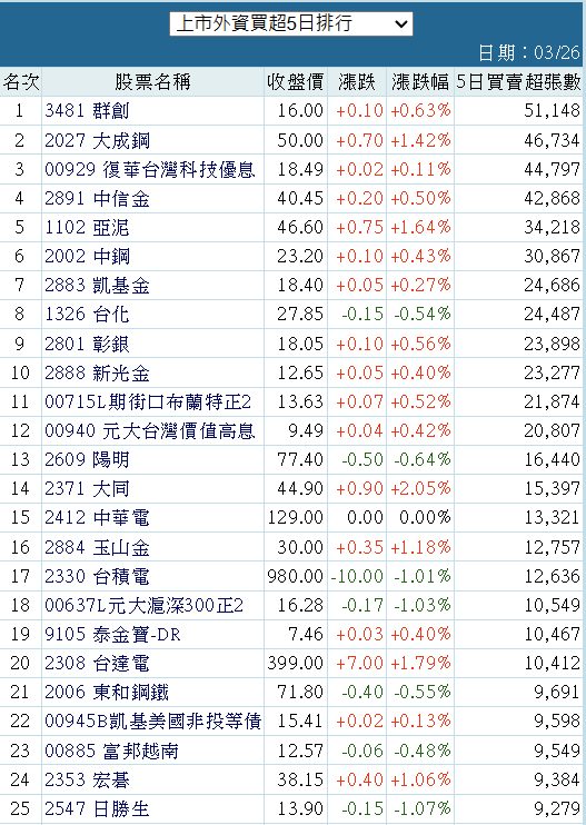 金森 追蹤 Lv.27 2025年03月26日 17:06 群創 大成鋼 復華台灣科技優息 中信金 亞泥 展開 +5 上市外資買超近5個交易日以來排行 8 0P 2則留言 分享 留言 讚 取消 送出 查看 2 則留言... 留言...
