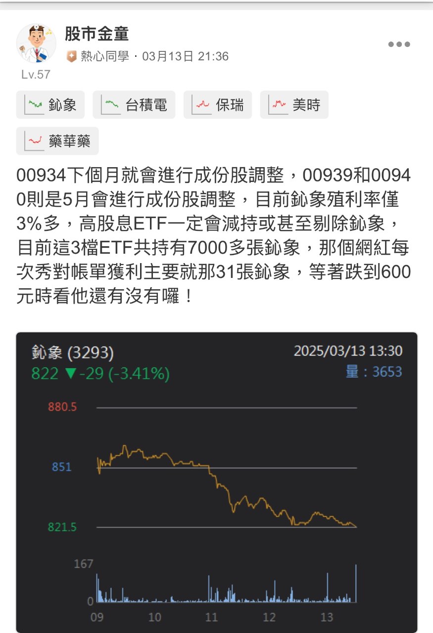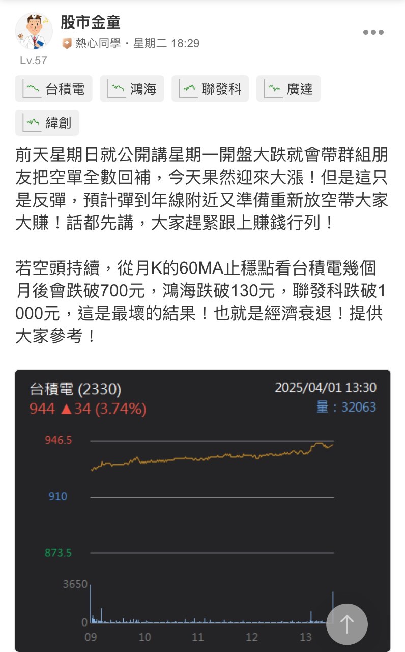 股市金童 追蹤 解答之神 Lv.57 2025年04月06日 13:54 台積電 鴻海 保瑞 鈊象 藥華藥 展開 +5 繼續閱讀 25 2P 11則留言 打賞 分享 留言 讚 取消 送出 查看 11 則留言... 留言...