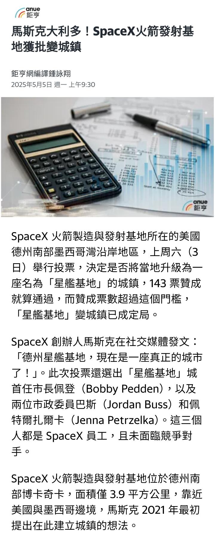 發城 追蹤 湊熱鬧達人 Lv.11 2025年05月05日 11:36 華通 展開 +1 SpaceX大利多!火箭發射基地獲批變城鎮... 繼續閱讀 7 0P 0則留言 打賞 分享 留言 讚 取消 送出 留言... 目前沒有任何討論