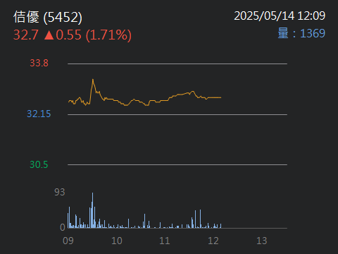【09:46 即時新聞】佶優(5452)強勢攻頂漲停,技術多頭排列+主力資金湧入,AI散熱題材點火盤中人氣