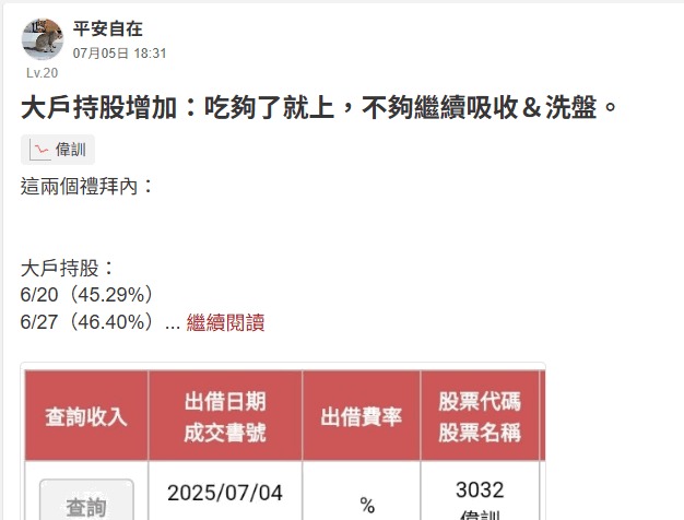 平安自在 追蹤 Lv.21 2025年07月12日 20:51.已編輯 偉訓 展開 +1 跟上週一樣:籌碼持續集中,但不知主力吃夠沒? 繼續閱讀 23 0P 0則留言 打賞 分享 留言 讚 取消 送出 留言... 目前沒有任何討論