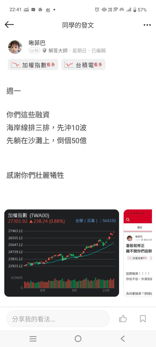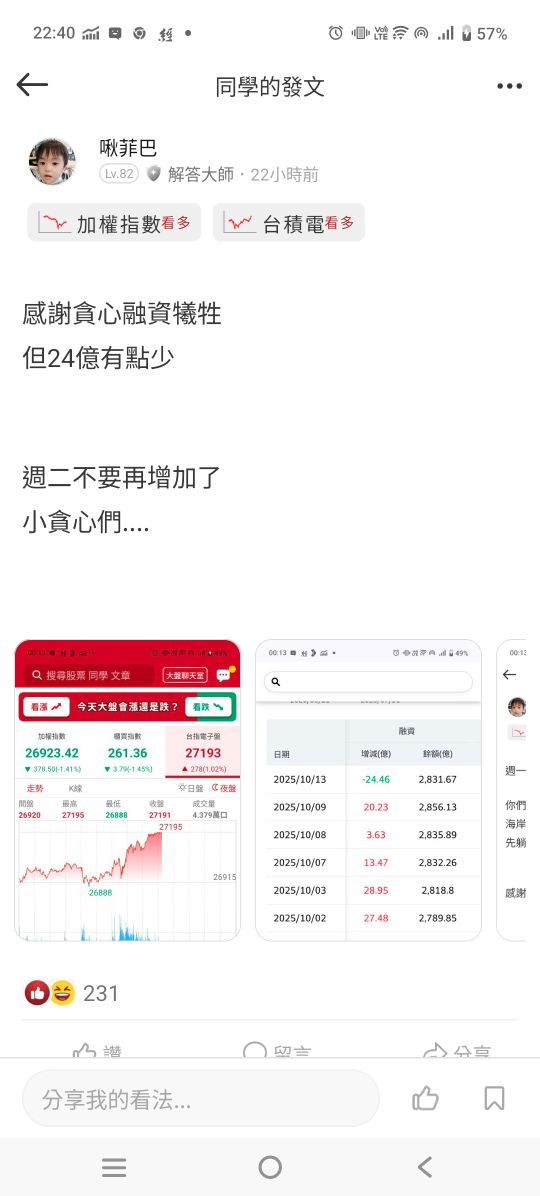 啾菲巴 追蹤 解答大師 Lv.82 10月14日 22:42 加權指數 台積電 NVDA 展開 +3 繼續閱讀 +3 啾菲巴 Lv. 82 粉絲: 追蹤 344 0P 15則留言 分享 留言 讚 取消 送出 查看 15 則留言... 留言...