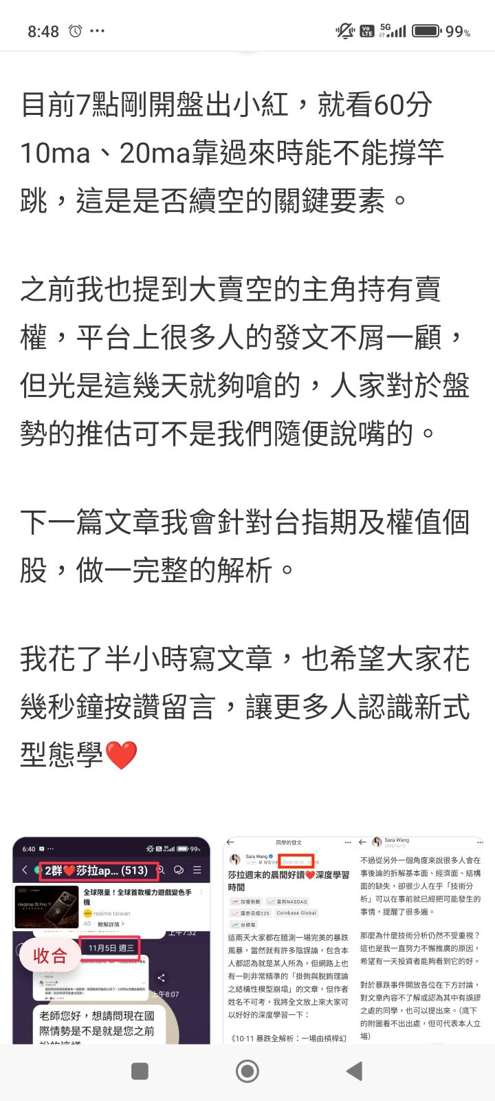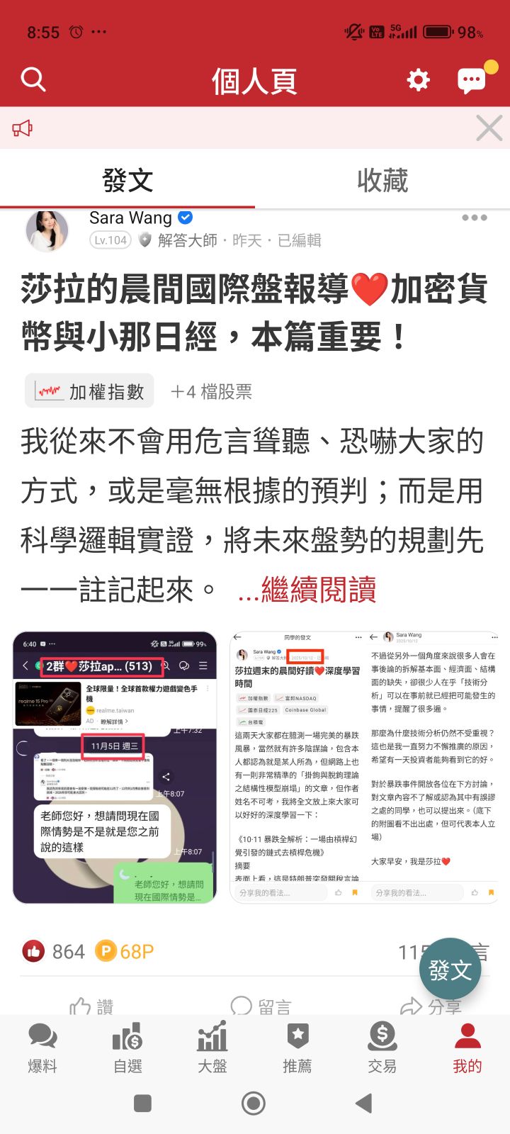 Sara Wang 追蹤 解答大師 Lv.104 11月08日 10:30.已編輯 加權指數 展開 +1 昨天夜裡大殺,收點小便當回來❤️ 繼續閱讀 +5 Sara Wang Lv. 104 粉絲: 追蹤 496 28P 62則留言 打賞 分享 留言 讚 取消 送出 查看 62 則留言... 留言...