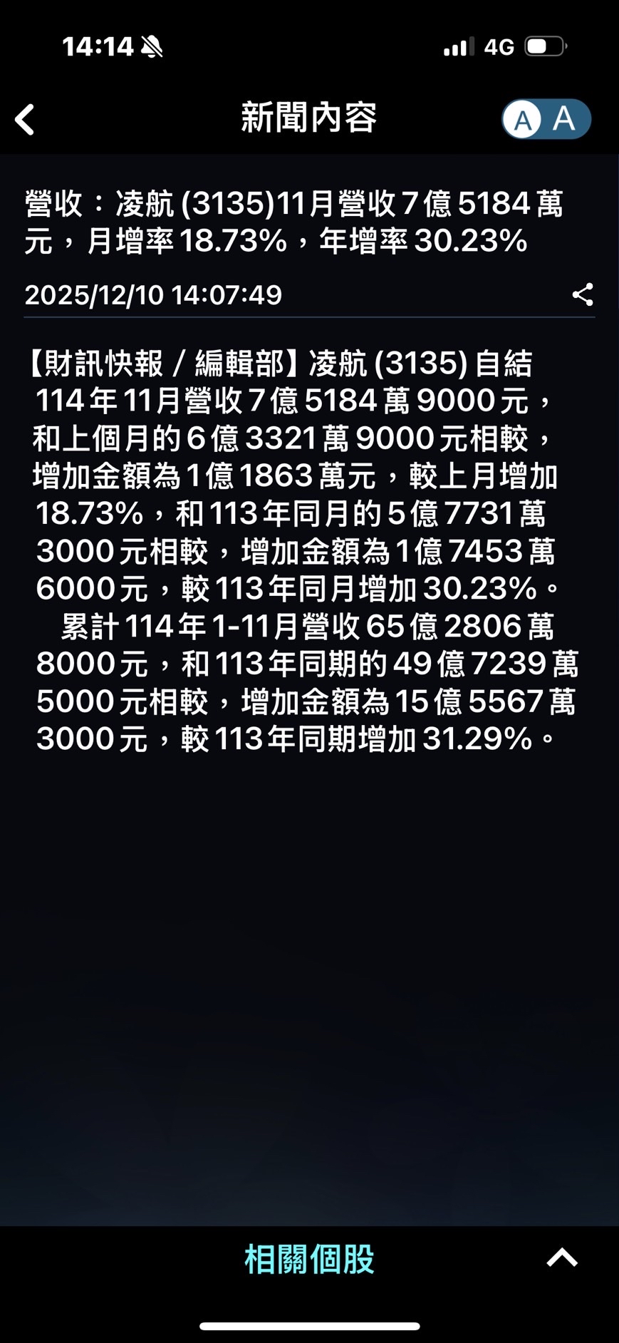 股海領航 追蹤 愛舉手同學 Lv.32 2025年12月10日 14:56 凌航 展開 +1 凌航 114年11月營收7.52億、年增30.23% 19 0P 2則留言 分享 留言 讚 取消 送出 查看 2 則留言... 留言...