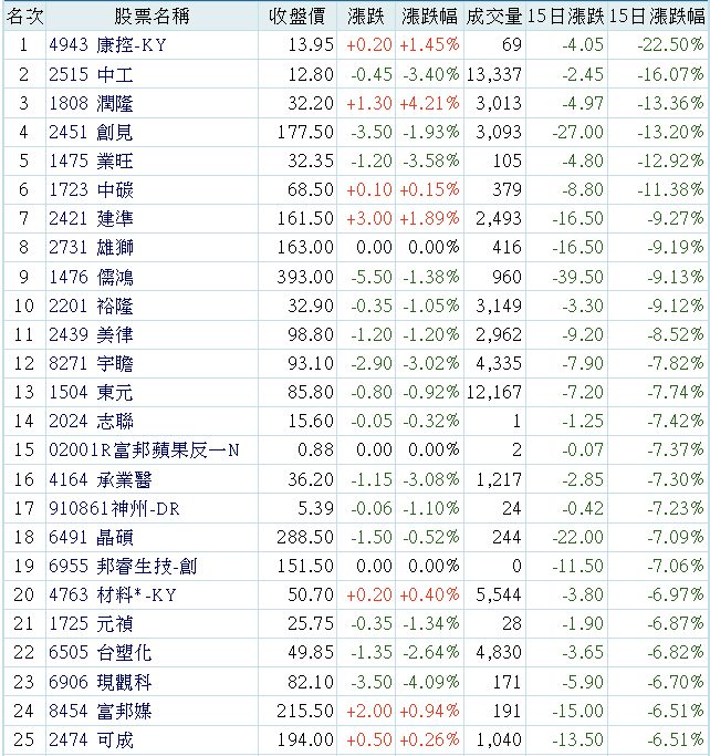 金森 追蹤 Lv.27 2025年12月10日 16:41 康控-KY 中工 潤隆 創見 業旺 展開 +5 上市股價跌幅近15個交易日以來排行 9 0P 1則留言 分享 留言 讚 取消 送出 查看 1 則留言... 留言...