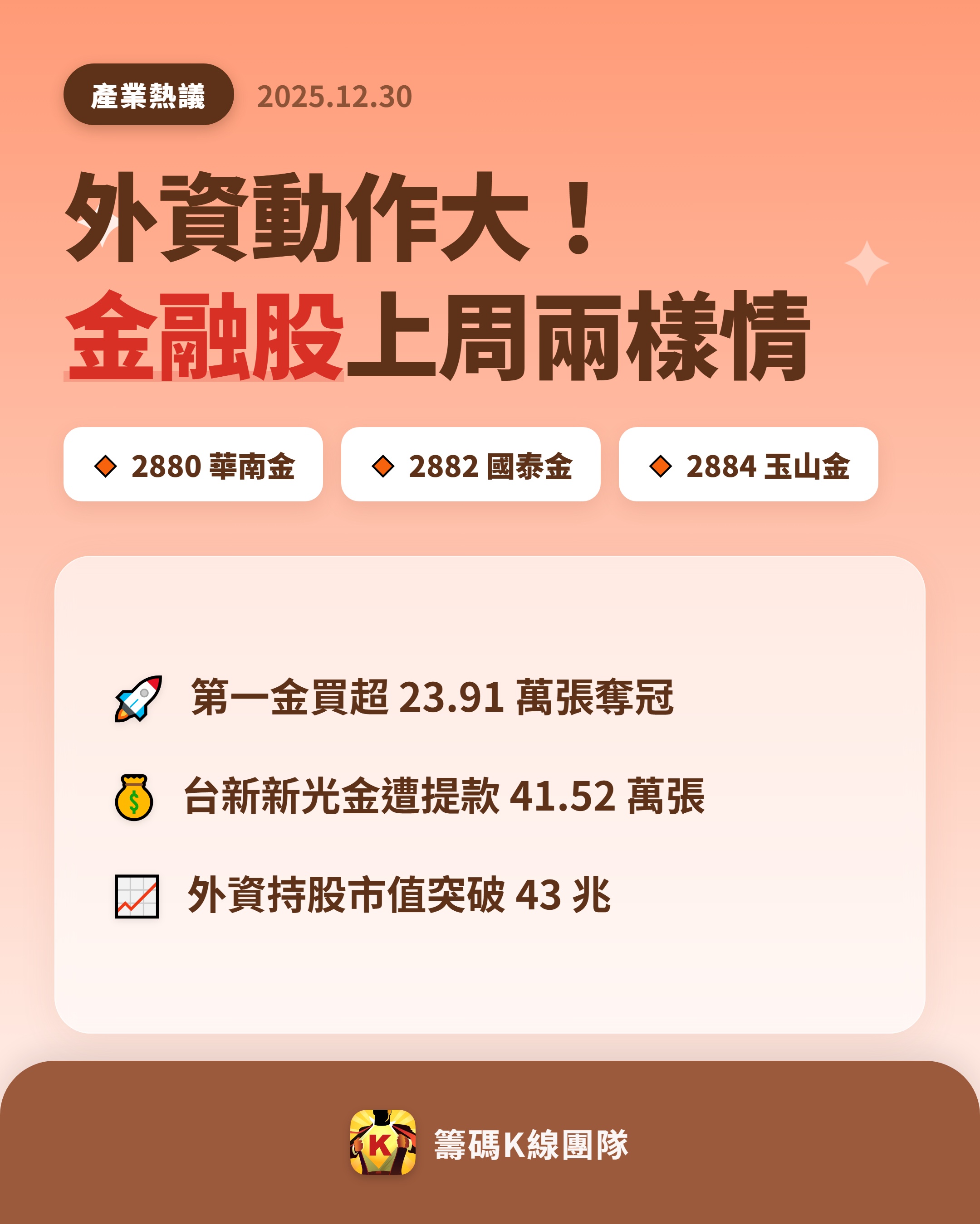 趨勢風向球 追蹤 Lv.19 2025年12月30日 01:13 華南金 國泰金 玉山金 台新新光金 中信金 展開 +6 繼續閱讀 3 1P 0則留言 打賞 分享 留言 讚 取消 送出 留言... 目前沒有任何討論