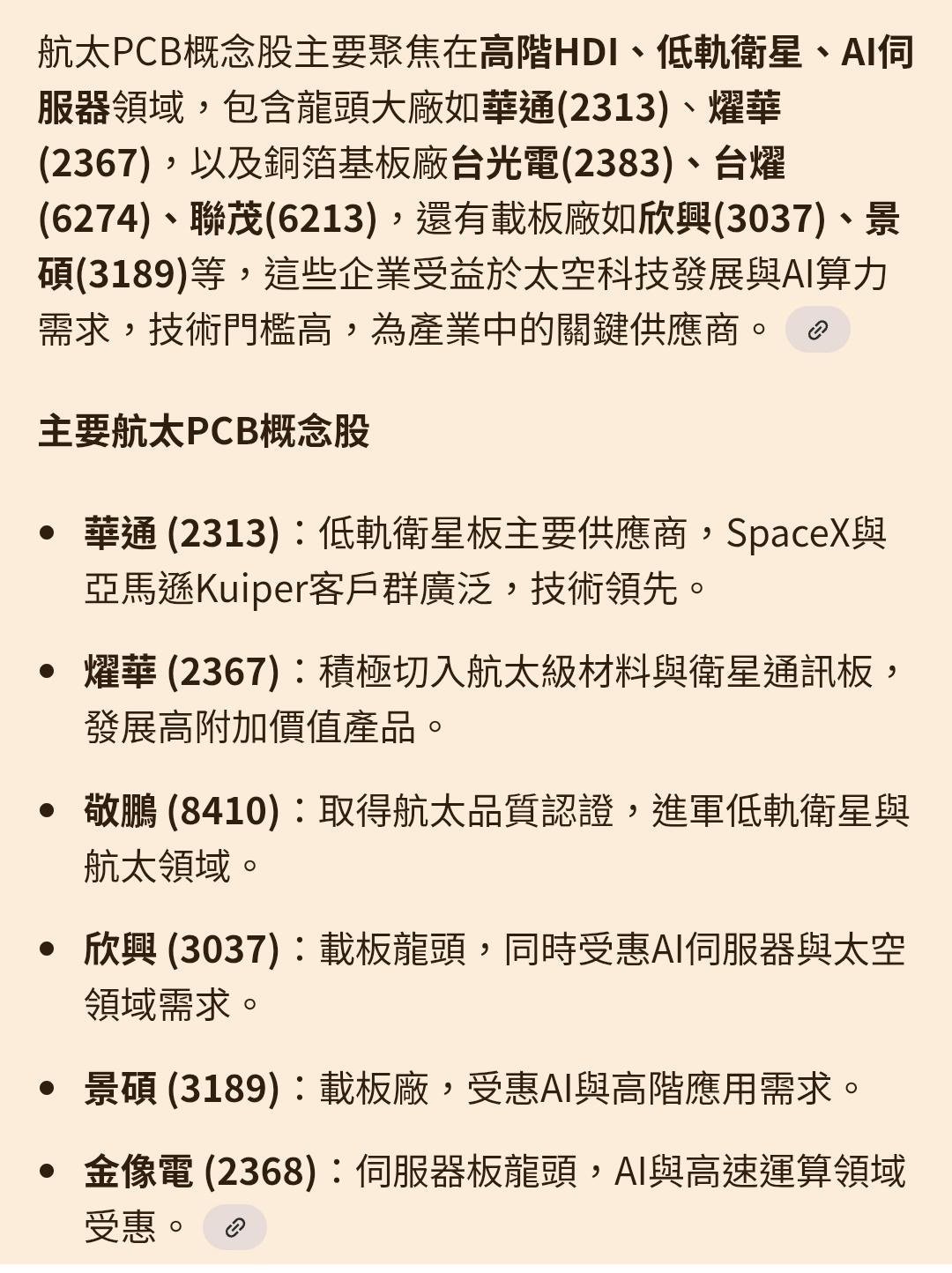樂透大🔥 追蹤 超級幫手 Lv.30 星期一 01:25 敬鵬 燿華 華通 騰輝電子-KY 欣興 展開 +5 敬鵬🔥低軌衛星用板傳捷報🔥取得AS 9100航太品質認證 繼續閱讀 27 2P 0則留言 打賞 分享 留言 讚 取消 送出 留言... 目前沒有任何討論