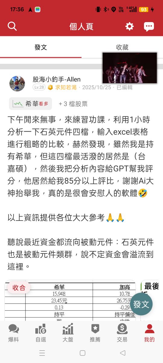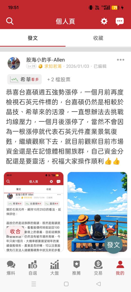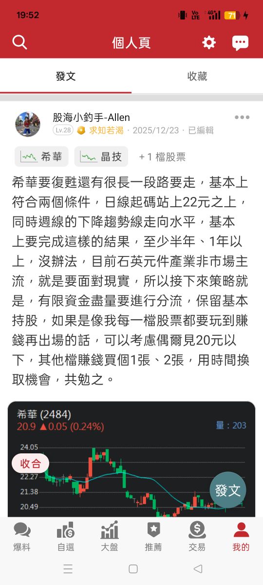 股海小釣手-Allen 追蹤 求知若渴 Lv.28 3小時前.已編輯 希華 台嘉碩 晶技 展開 +3 感謝文 33 29P 3則留言 打賞 分享 留言 讚 取消 送出 查看 3 則留言... 留言...