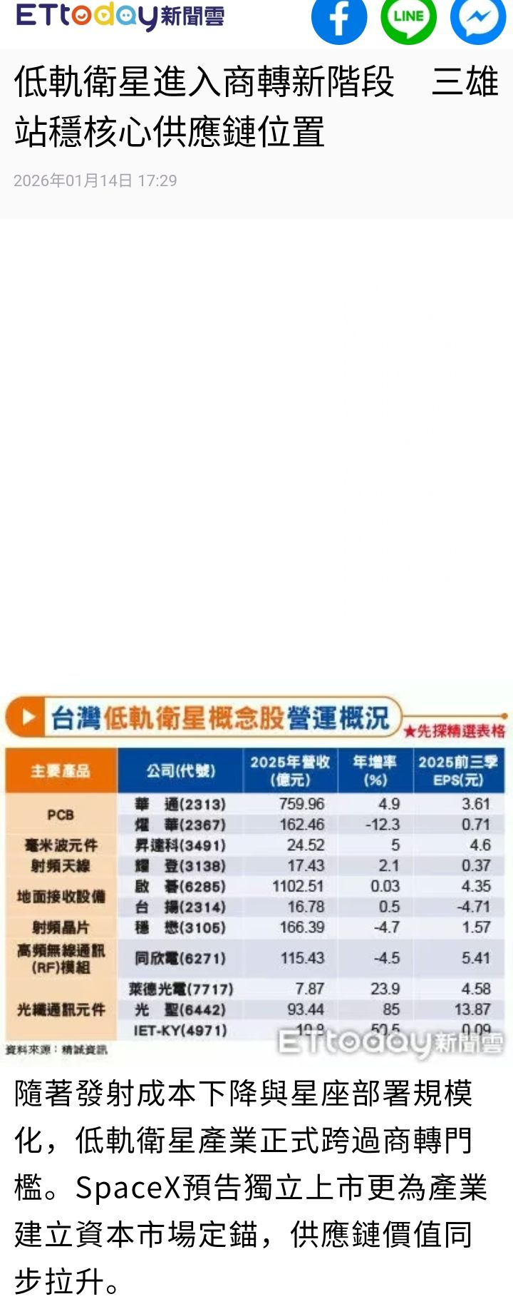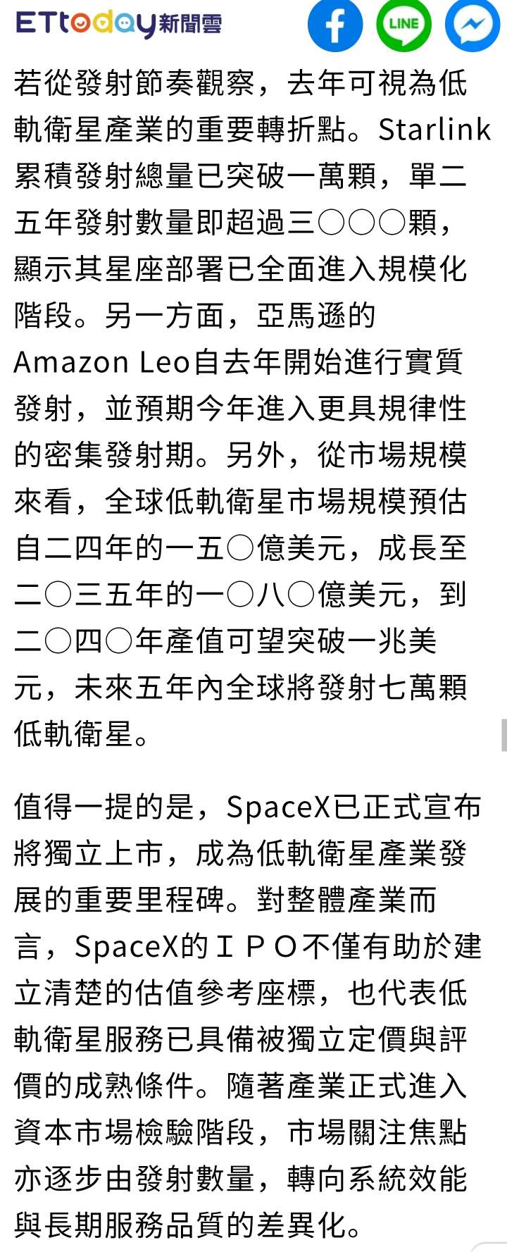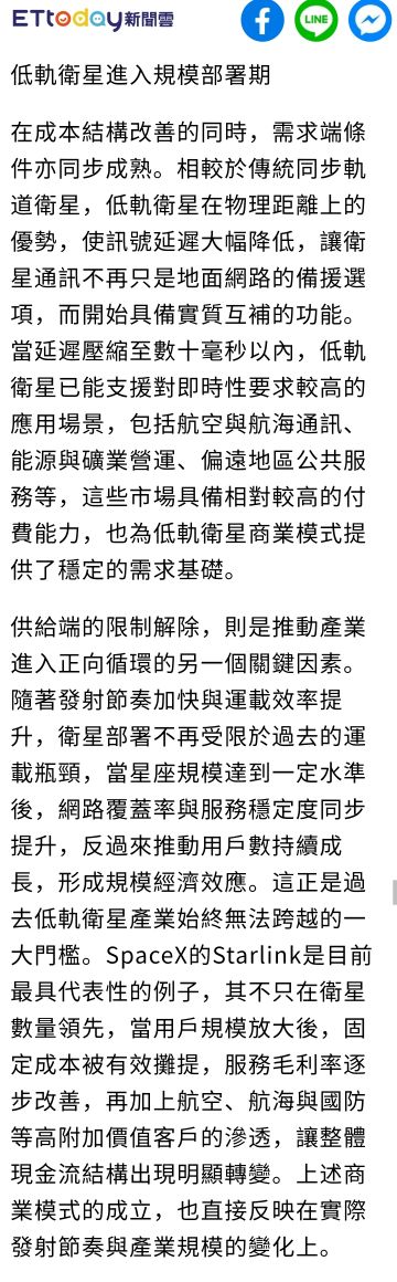 飆哥一路衝 追蹤 Lv.9 昨天 21:00 華通 燿華 昇達科 金寶 展開 +4 未來五年內 全球將發射七萬顆低軌衛星 去年度 僅約4000顆 繼續閱讀 +3 38 2P 1則留言 打賞 分享 留言 讚 取消 送出 查看 1 則留言... 留言...