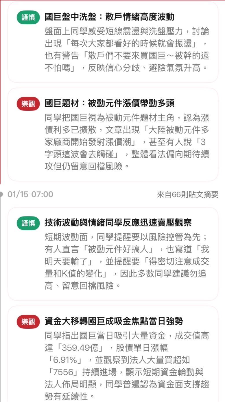 東迅財經洞察與智慧決策 追蹤 好奇同學 Lv.5 6小時前.已編輯 國巨* 展開 +1 你認為明天1/16(五)國巨會漲或跌? 繼續閱讀 +3 28 6P 4則留言 打賞 分享 留言 讚 取消 送出 查看 4 則留言... 留言...