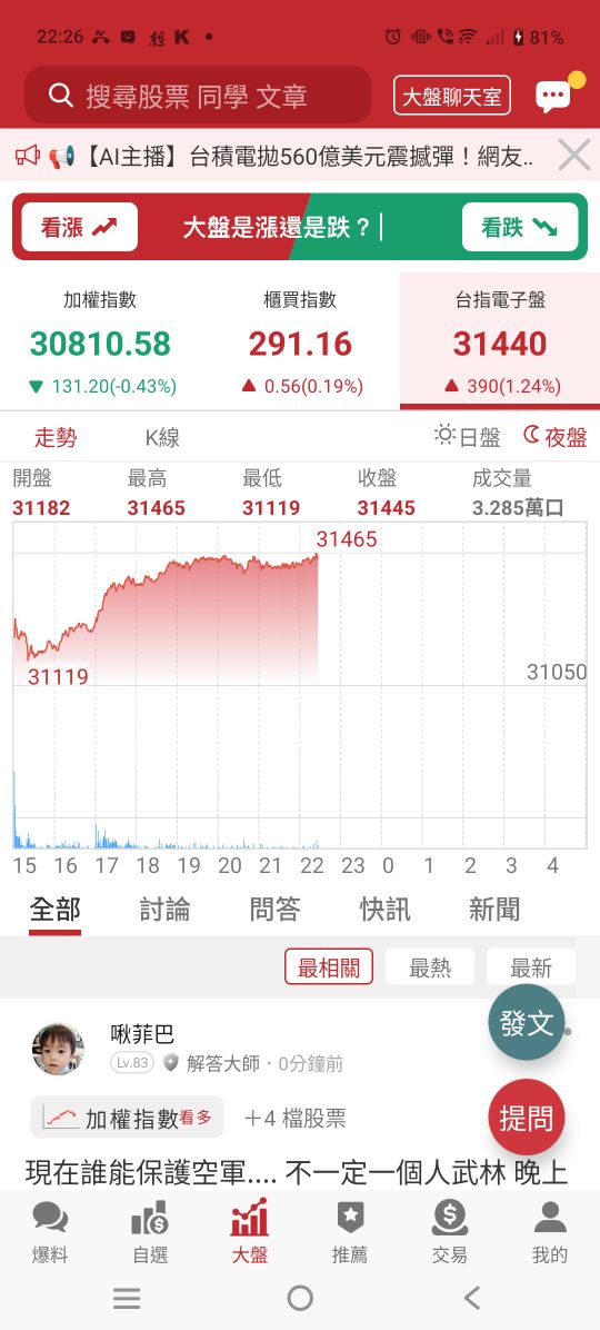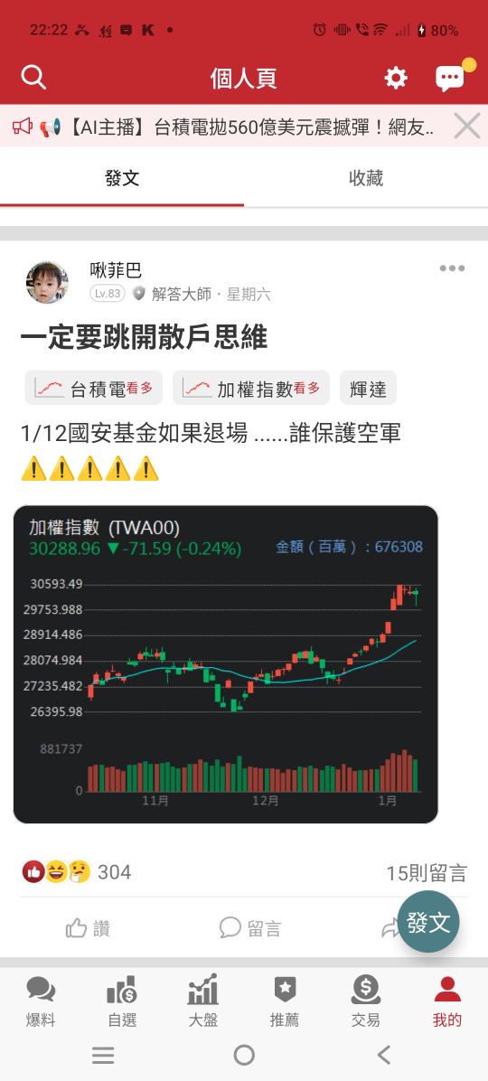 啾菲巴 追蹤 解答大師 Lv.83 昨天 22:26.已編輯 台積電 元大高股息 加權指數 NVDA 元大台灣50 展開 +5 繼續閱讀 286 0P 12則留言 分享 留言 讚 取消 送出 查看 12 則留言... 留言...