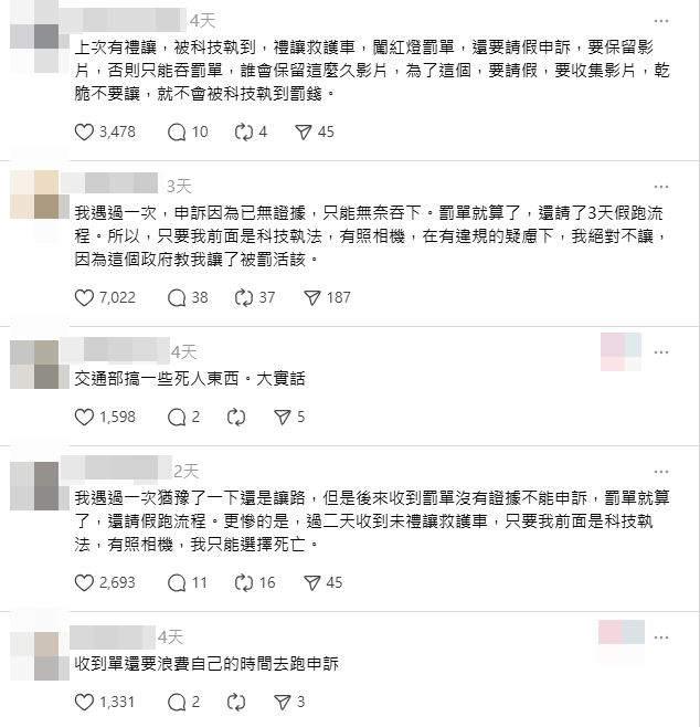 為了擺脫「交通地獄」惡名,各地積極推動科技執法;不過,近日有網友分享影片,表示因路口設有科技執法設備,現場車輛沒人敢往前禮讓,導致救護車卡在車陣長達4分鐘。畫面掀起熱烈討論,大票駕駛人幫高調,直呼「真的缺乏人性。」 《詳全文...》...