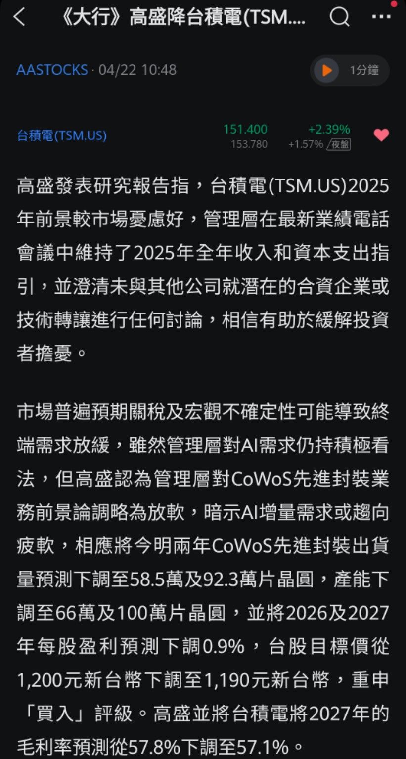 實戰動能選股 追蹤 Lv.22 2025年04月21日 15:45 台積電Q1財報優於預期,適合進場嗎? 台積電 南亞科 世芯-KY 華經 鴻海 展開 +6 繼續閱讀 7 0P 1則留言 分享 留言 讚