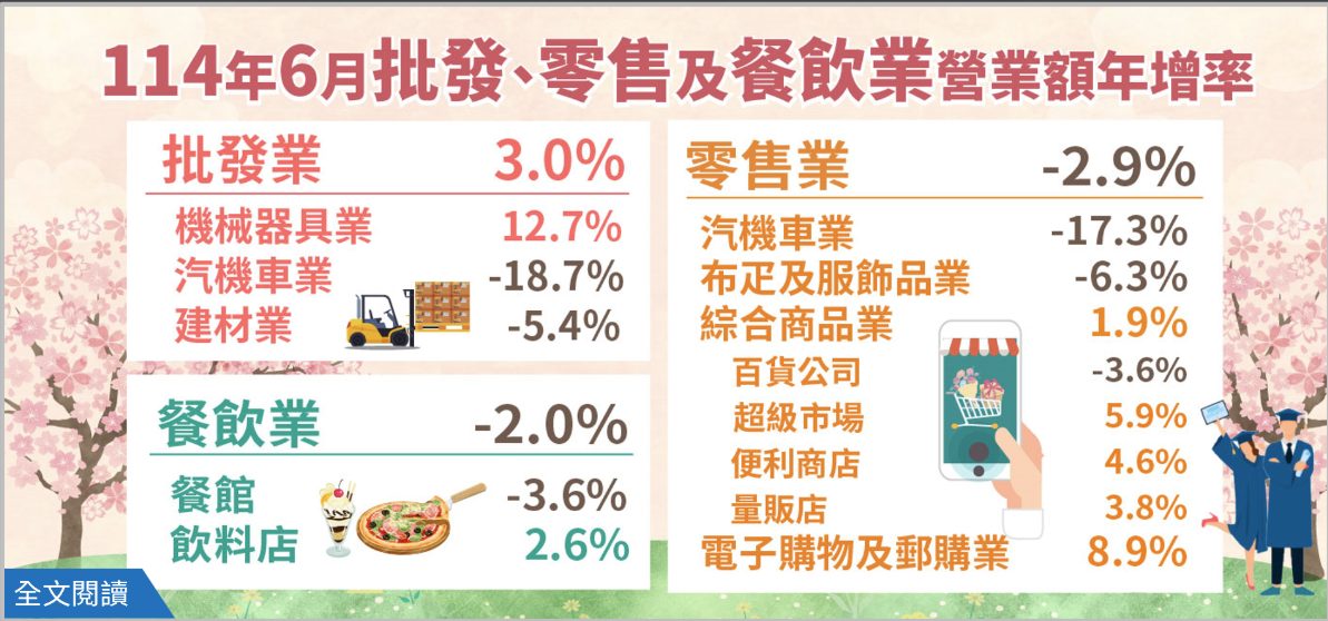 金森 追蹤 Lv.27 2025年07月23日 17:52 零售營業額連三月負成長,汽機車最慘... 元大台灣50 國泰永續高股息 元大高股息 富邦台50 群益台灣精選高息 展開 +6 114年6月批發、零售及餐飲業營業額統計 繼續閱讀 9 1P 0則留言 打賞 分享 留言 讚