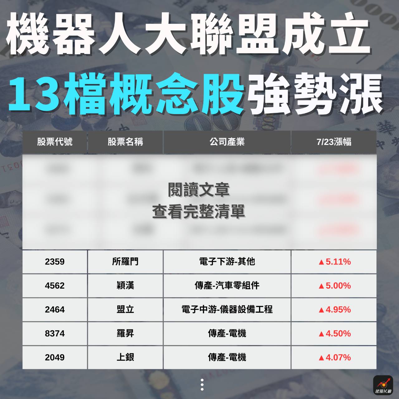 想抓起漲股🔥就用起漲K線💪 追蹤 好奇同學 Lv.39 2025年07月23日 17:25 台股動能強?台股會到24,000嗎? 神達 富喬 精成科 台玻 南亞科 展開 +6 【AI機器人大聯盟成立,「13檔概念股」強勢上攻】 7 0P 0則留言 打賞 分享 留言 讚
