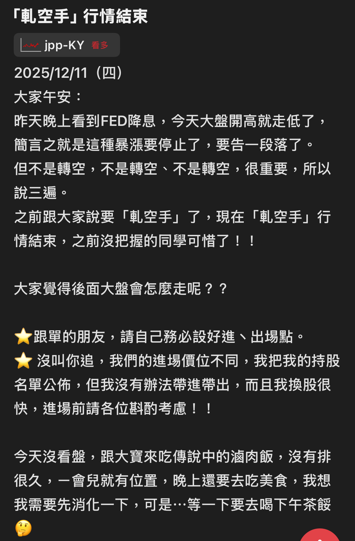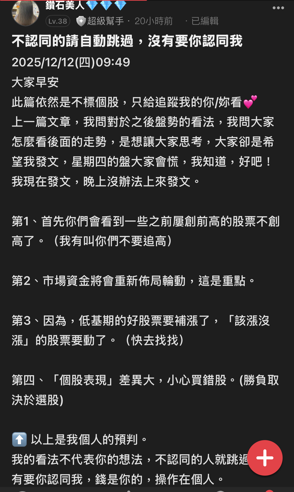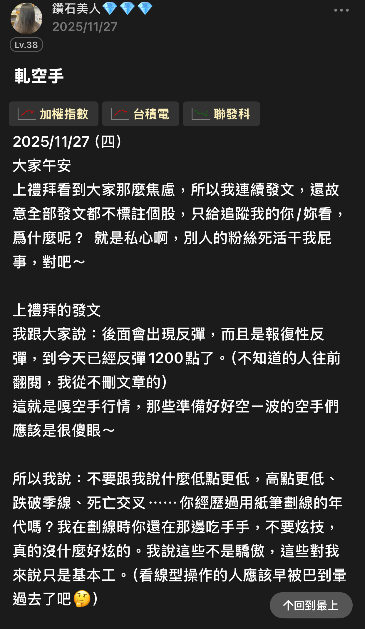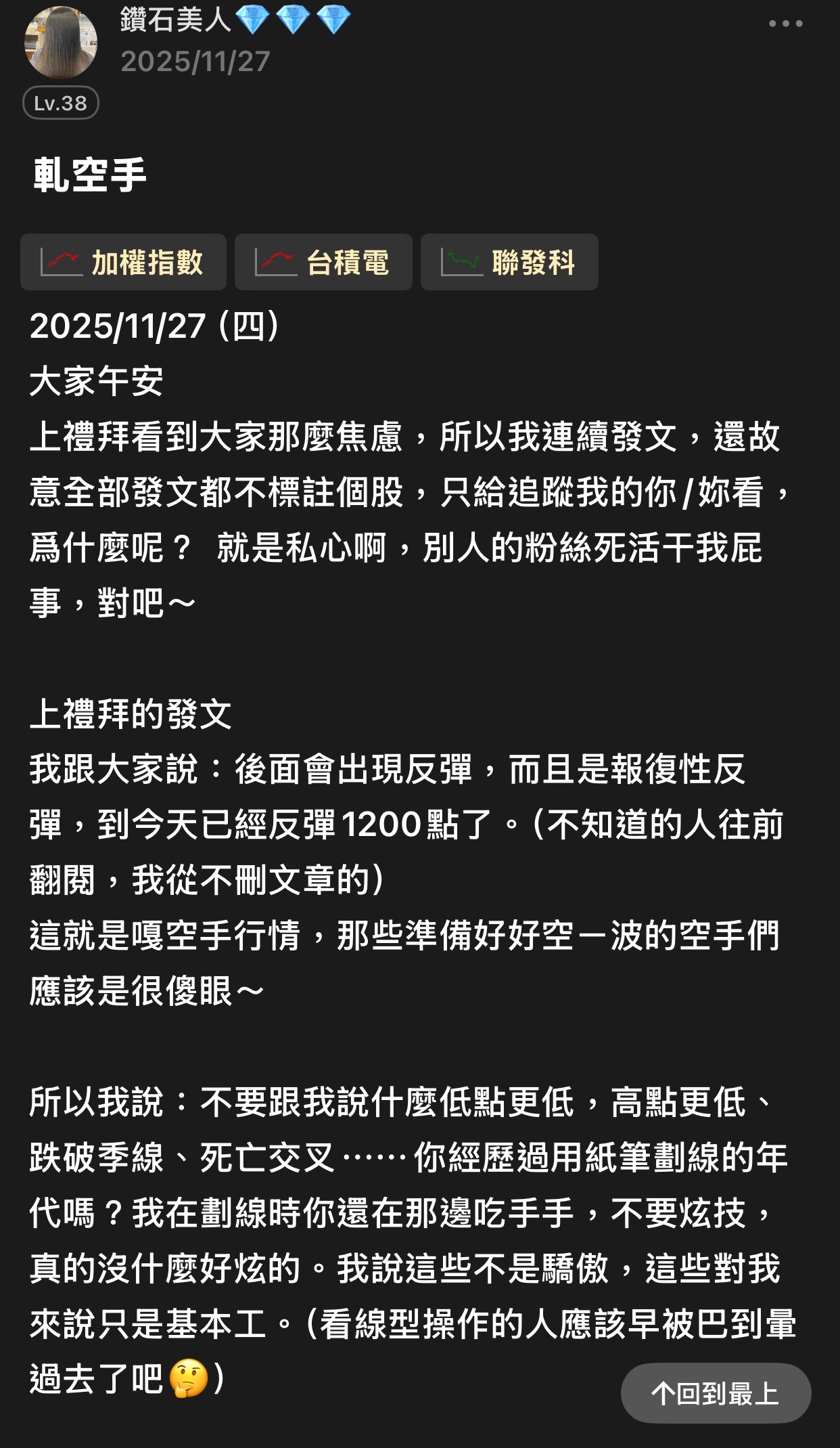出言不遜,我直接封鎖,聽清楚!這是我的版,我做決定!!! 還有⋯不要開小號來留言和按噓👎,你們不用賺錢嗎?或者這就是你們的職業?? 我不追明牌,因為我要成為明牌 我不會退縮,因為我會一直學習 我不用做球,因為我向來是單打 教養禮貌的,視之朋友 以禮相待 傲慢粗魯的,視如敝屣 嗤之以鼻 投資市場裡 ...繼續閱讀