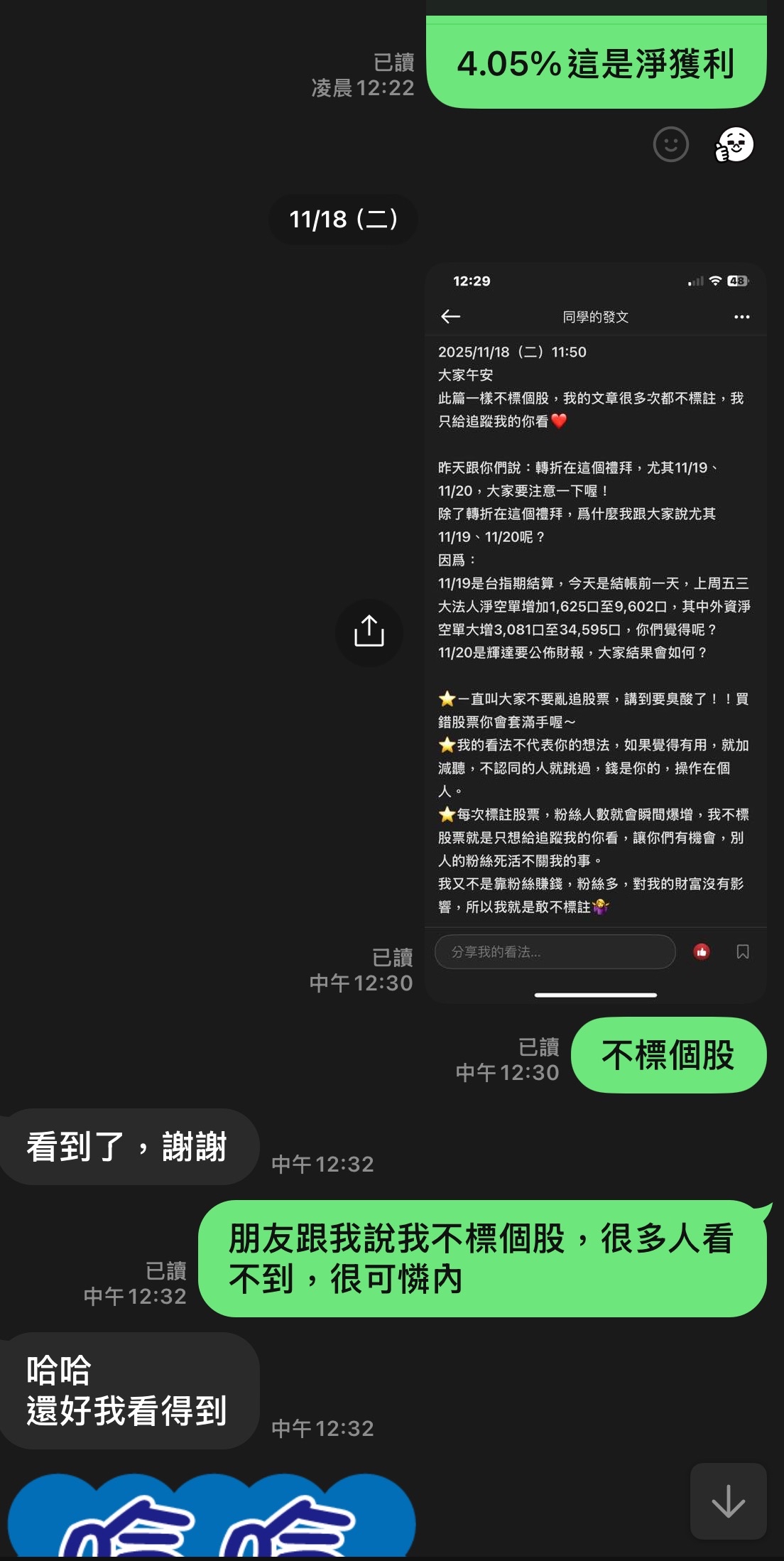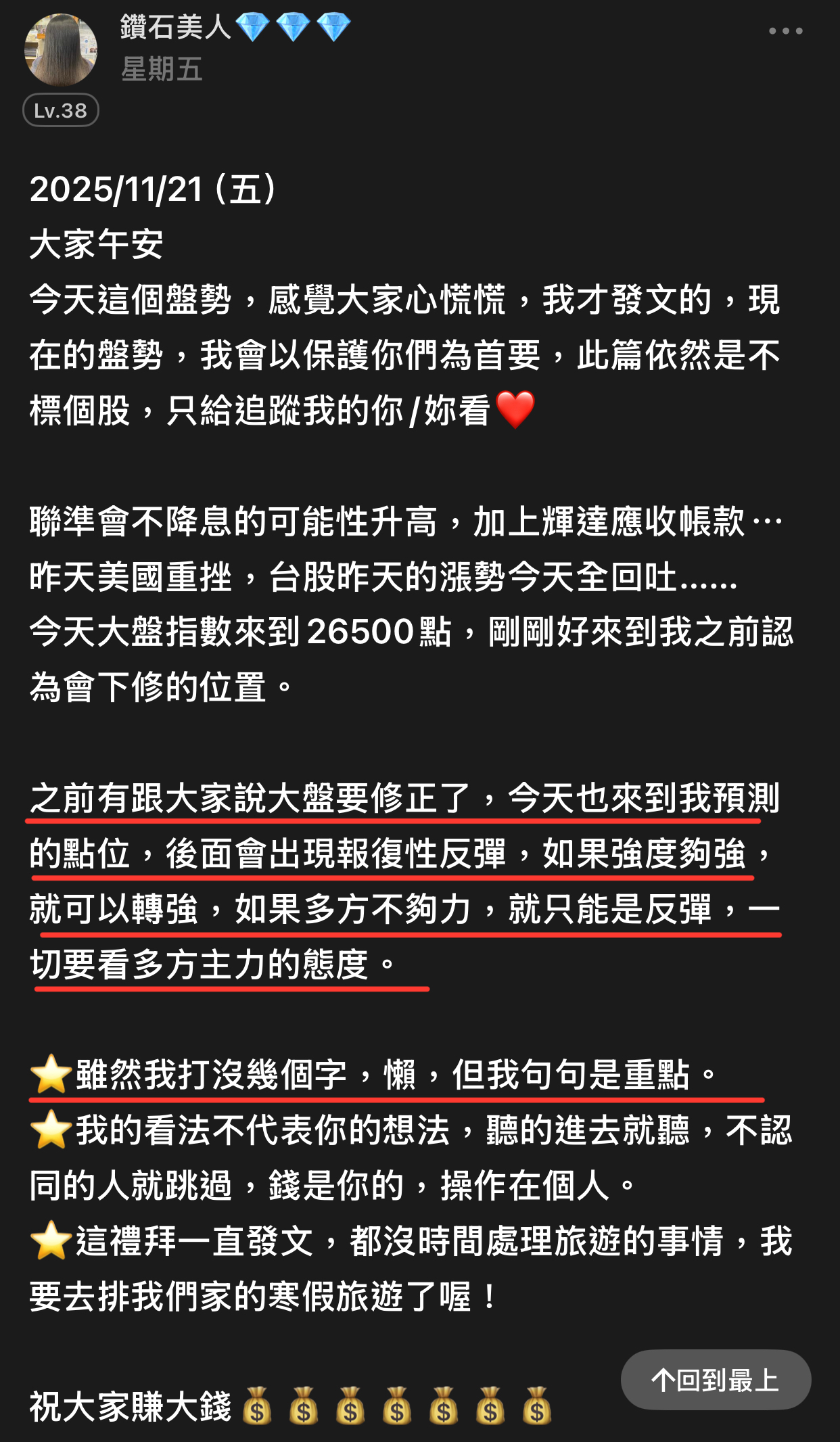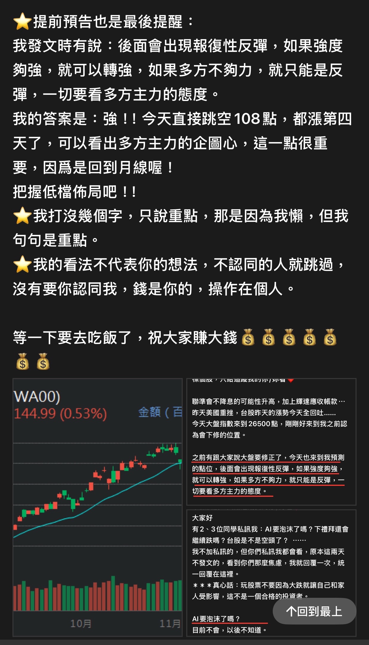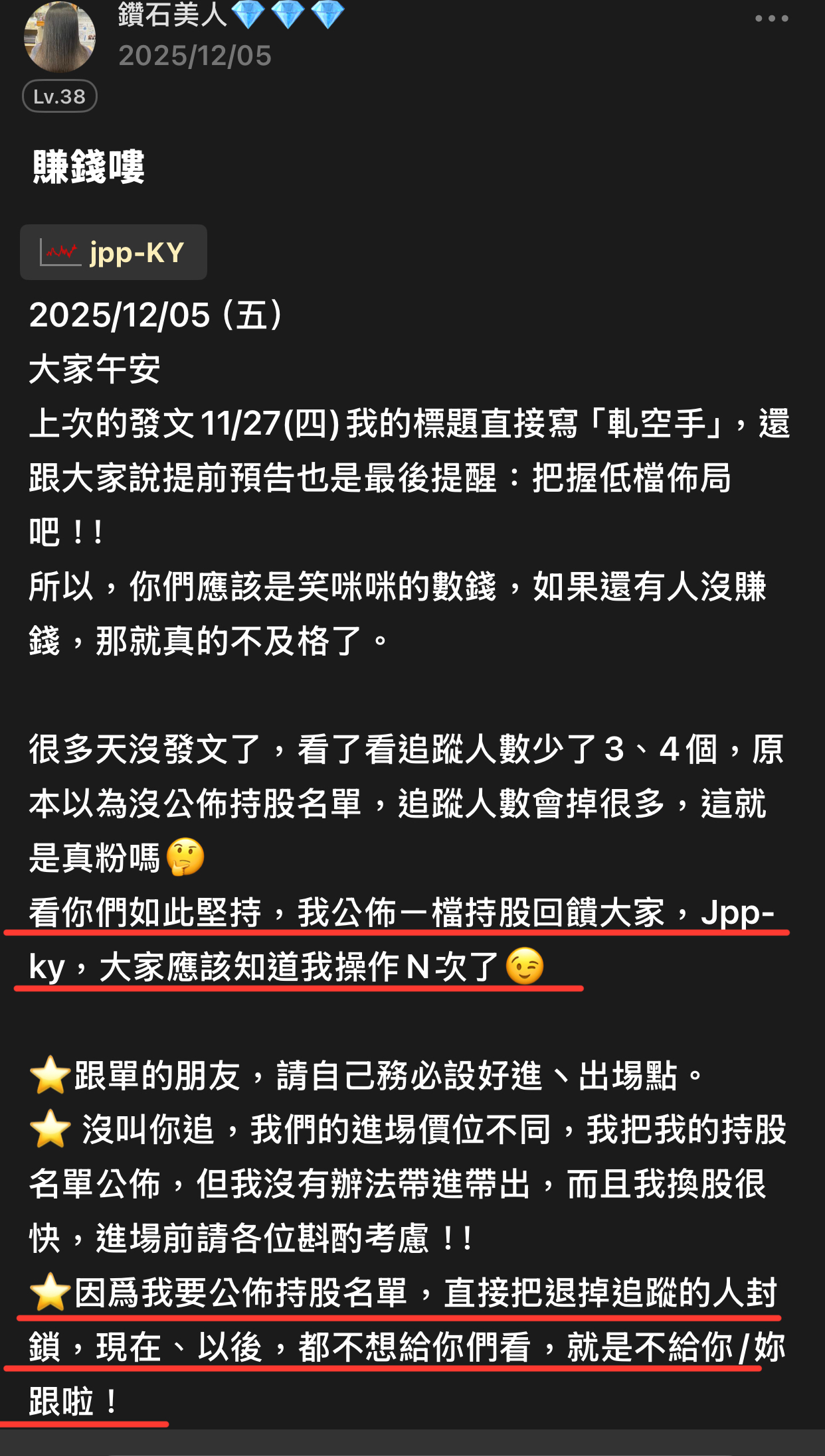 出言不遜,我直接封鎖,聽清楚!這是我的版,我做決定!!! 還有⋯不要開小號來留言和按噓👎,你們不用賺錢嗎?或者這就是你們的職業?? 我不追明牌,因為我要成為明牌 我不會退縮,因為我會一直學習 我不用做球,因為我向來是單打 教養禮貌的,視之朋友 以禮相待 傲慢粗魯的,視如敝屣 嗤之以鼻 投資市場裡 ...繼續閱讀