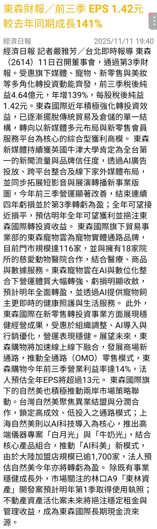 MyGoodLife 追蹤 熱心同學 Lv.8 2025年11月11日 18:22.已編輯 加權指數 東森 展開 +2 東森國際 2025前三季 基本每股盈餘:1.42 30 0P 6則留言 分享 留言 讚