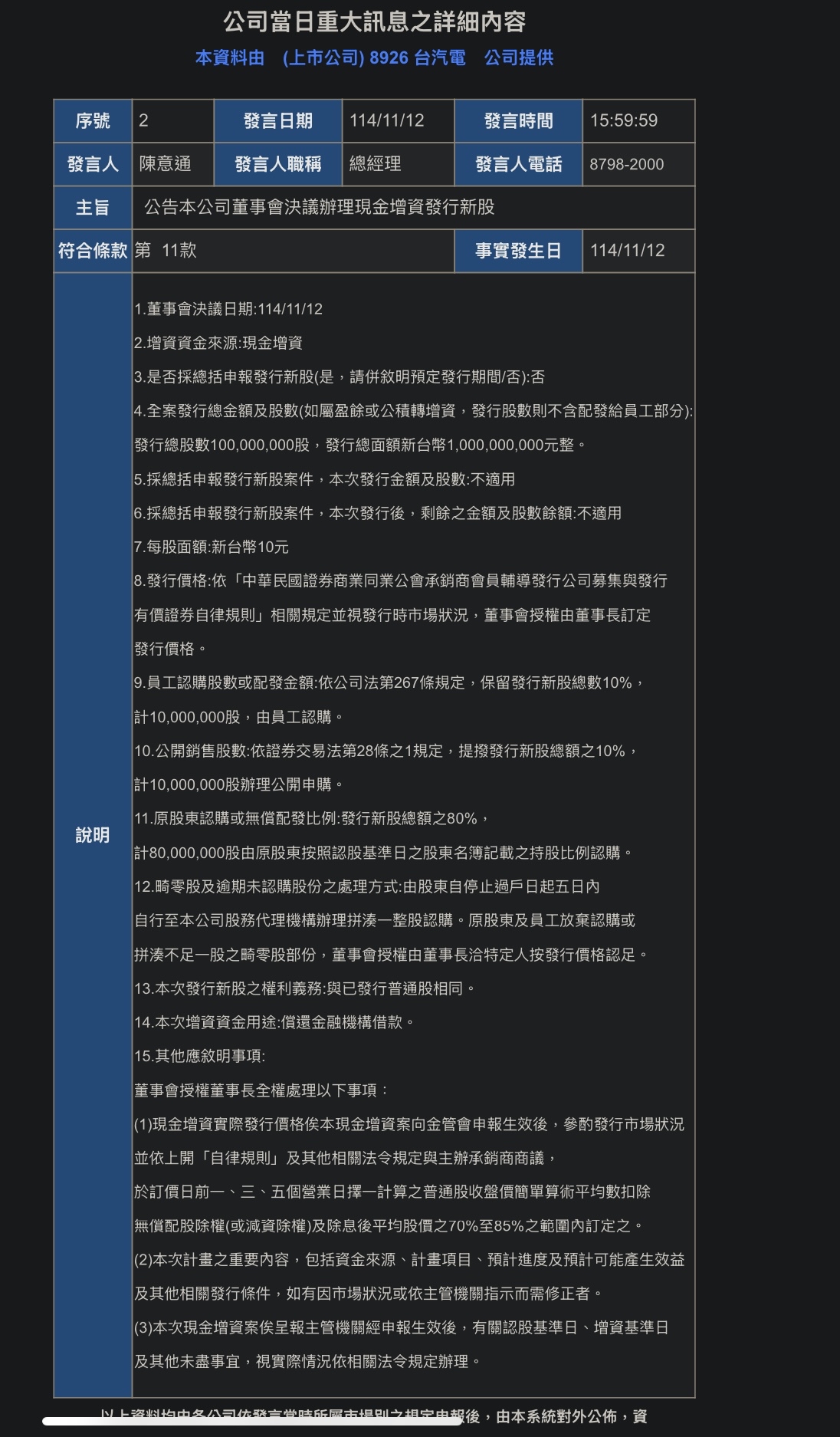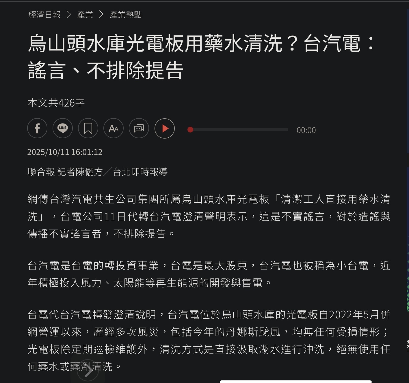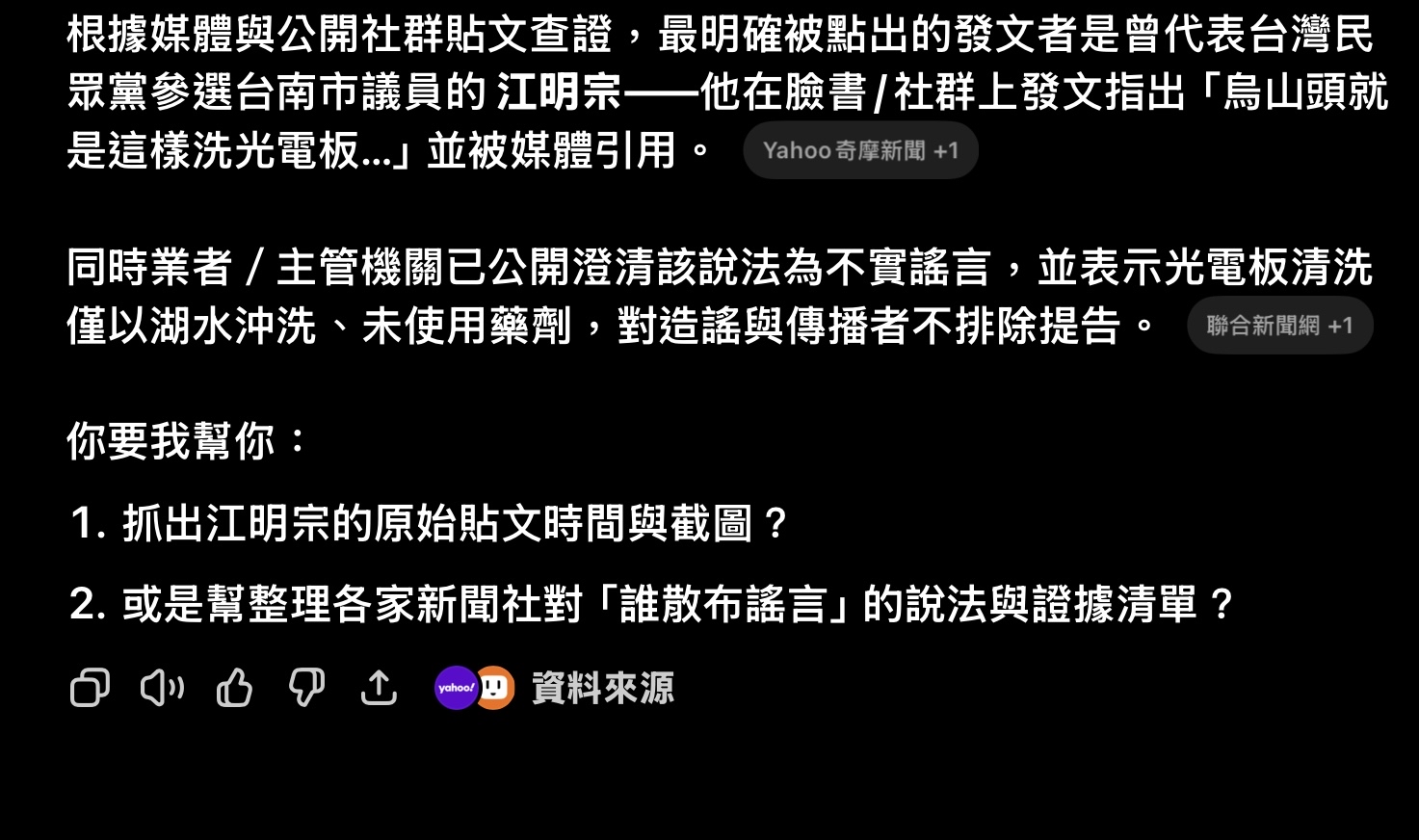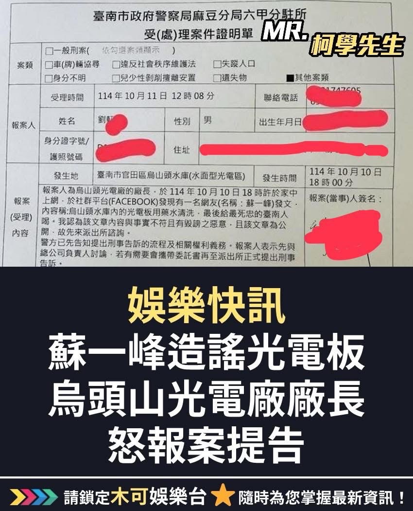 網紅醫生蘇一峰近日指控,清潔工人以藥水、清潔劑清洗台南烏山頭水庫上方的光電板,最後讓「最死忠的台南人喝光電水」。雖水質報告證實為烏龍一場,仍引起一定恐慌。民進黨立委陳亭妃日前質詢時,則要求中央保證,未來四大水庫,絕對不得再核准任何光電執照。今(15日)民進黨召開中常會,黨主席賴清德也詢問陳亭妃此事「是否有政策上誤會」?陳則喊冤自己被斷章取義。賴清德則嚴肅表示,現在出現很多謠言,執政團隊很努力澄清,地方民代、執政團隊一員,也應協助澄清這些不實謠言。