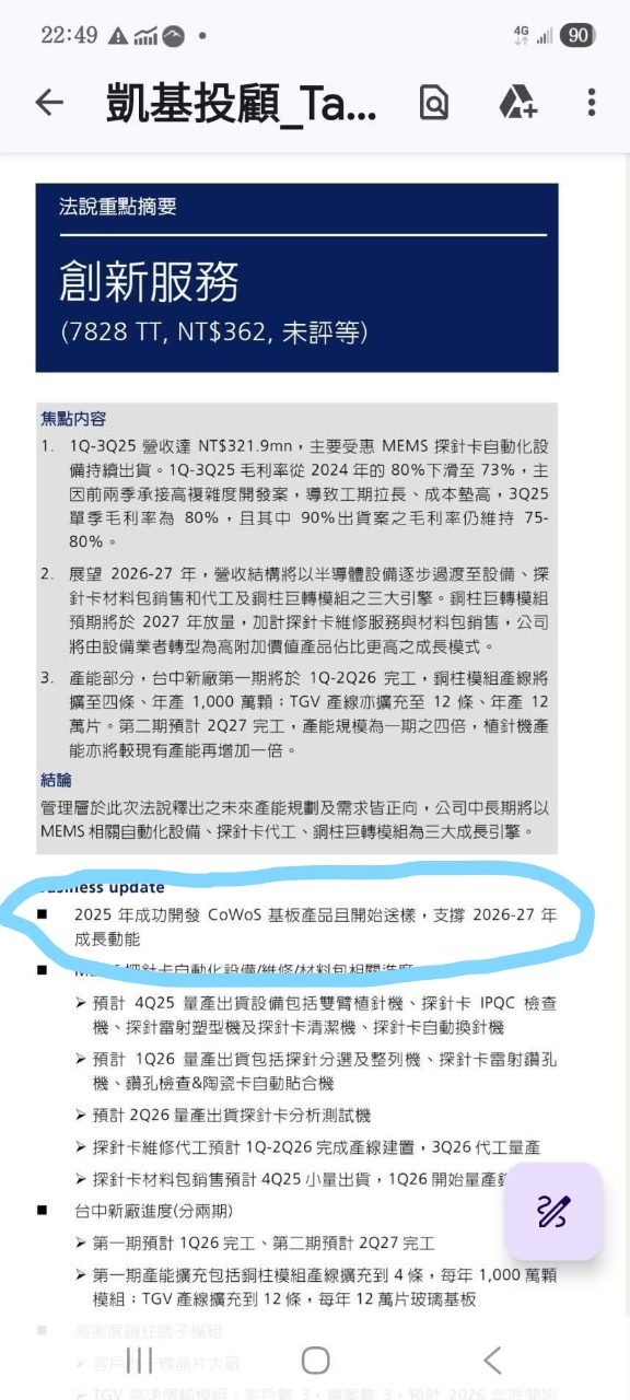 ajpomyxupz 追蹤 Lv.4 01月03日 09:39 創新服務 展開 +1 創新服務的老闆真不會炒股 晶呈切入矽光子領域|半導體|產業新聞|產科國際所【IEK產業情報網】IEK_logo_轉成圖形2 <p>半導體特用氣體廠晶呈科技(4768)開拓多元產品線,加碼布局TGV玻璃載板,期以技術應用,切入矽光子領域。公司近日表示,TGV載板生產、導入進度提前,預估明年第1季開始貢獻營收,並預計明年相關TGV產品營收倍增。TGV提前放量,法人看好相關產品需求前景及成長空間,並認為將改善目前獲利結構。 < 22 47P 3則留言 打賞 分享 留言 讚