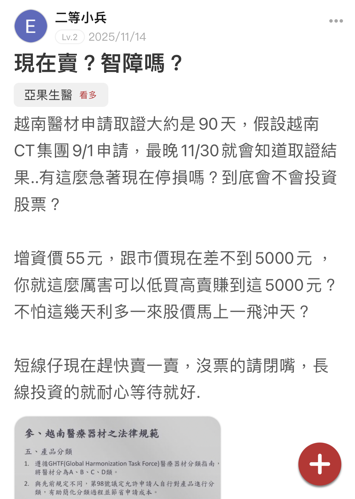 五等小兵 追蹤 好奇同學 Lv.5 2025年12月05日 09:32 亞果生醫 展開 +1 股價上漲酸民就不見了,最可憐的是被騙賣在60元左右的韭菜散戶 繼續閱讀 10 0P 3則留言 分享 留言 讚