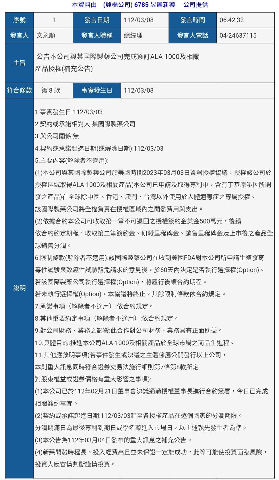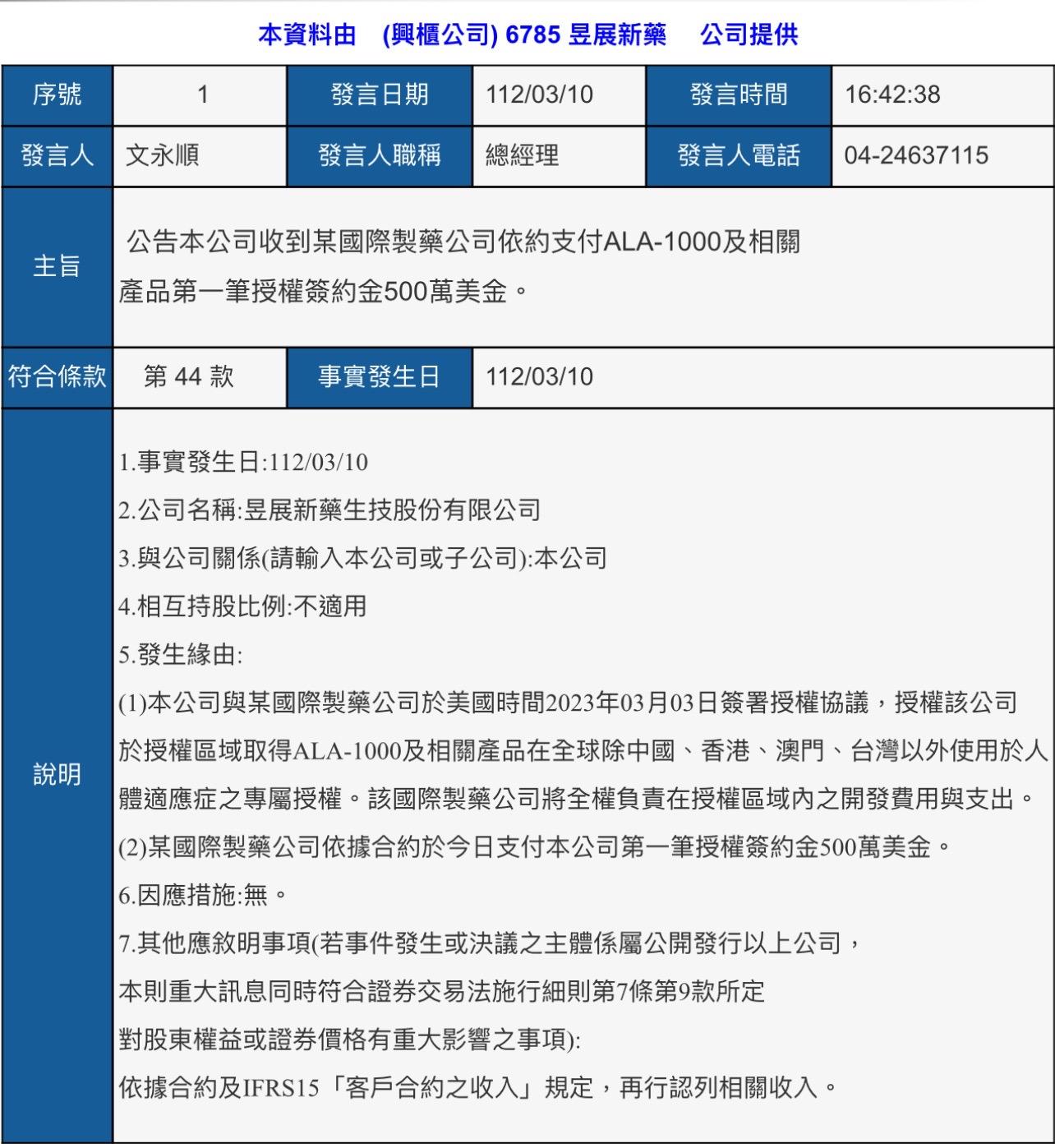 HY2000 追蹤 Lv.6 2023年10月12日 15:30 昱展新藥 展開 +1 昱展改良劑型新藥賣回原開發廠 最高權利金8.62億美元 | 聯合新聞網 昱展新藥(6785)今(12)日宣布, 已接獲國際大廠Indivior通知,將履行昱展所開發的505(b)(2)新藥ALA-1000三個月長效注射劑(long-acting injectable, LAI)與相關丁基原啡因(Buprenorphine)前驅藥產品全球專屬授權協議之選擇權。據了解,昱展與Indivior合約共三項產品,連同前期里程金在內,總計可獲最高8.62億美元權利金。 聯合新聞網 7 0P 2則留言 分享 留言 讚