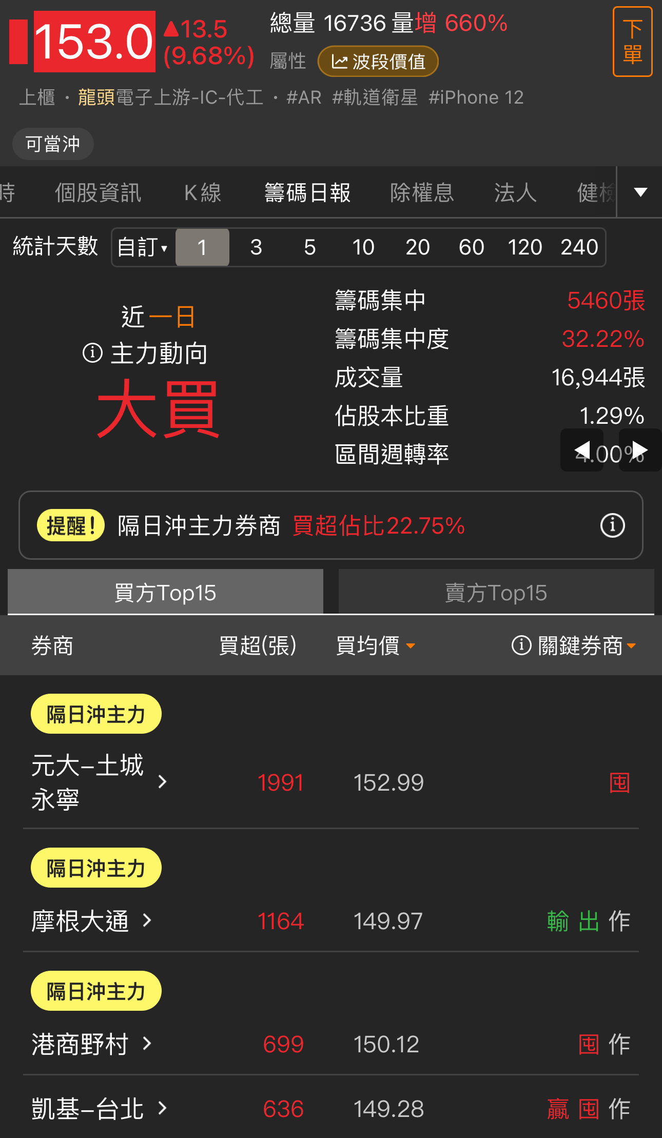 目前從開盤到現在的狀況,台積電開高之後目前是開高走低且目前預估量約58000張,因此可初步判定台積電雖然有展開日線第5波的攻勢,但不是很乾脆,是有可能創高一小段就拉回的走勢,如果是這樣台積電第5波不會很長,而且不能排除這真的非常有可能就已經是確認目前台積電(加權指數)就是漲5-5末升段了,當然由於目前最大可能是不斷創一小段新高就拉回的走勢,因此時間會拖的很久,目前先不考慮走空就是個股表現。 至於個股表現今天還是記憶體族群表現最好,而且不論記憶體次族群製造、模組、IC封測、IC設計都有好幾檔股票大漲,再度驗證記憶體就是市場續航力最強主流。 最新大盤動態更新 "大盤又上去了" 是的, 大盤比台積電強,所以大盤位階是5-5,還是重新修訂為3-3今天沒辦法看出來。