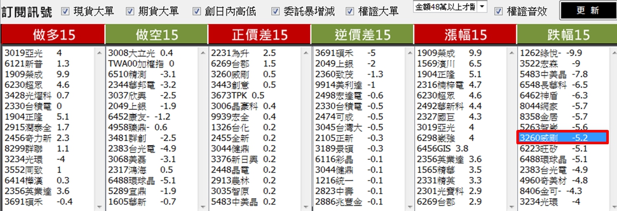 馬上吸引到我的注意!其中 威剛( 3260 ) 顯示跌幅高達 5%,