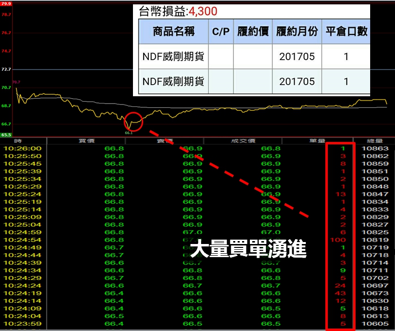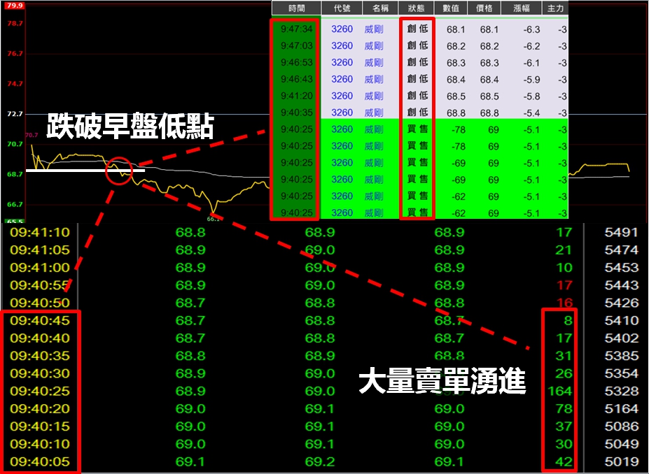 發現有多筆大單賣出,且當時股價跌破了早盤的低點,
