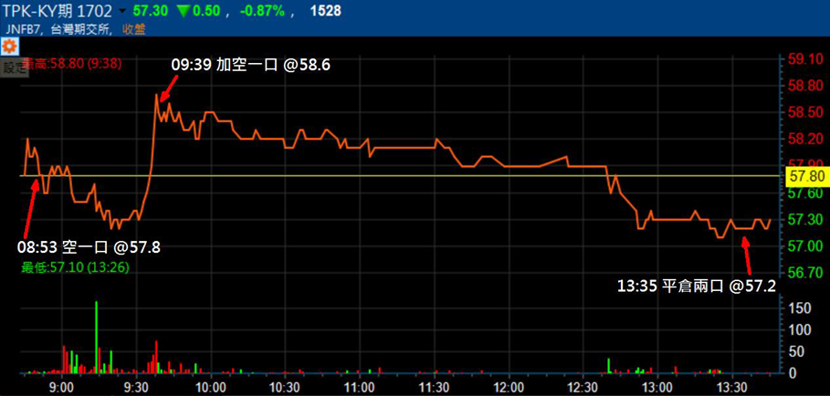 所以我按照昨日擬好的策略,馬上就掛價賣出一口,成交在 57.8 元!