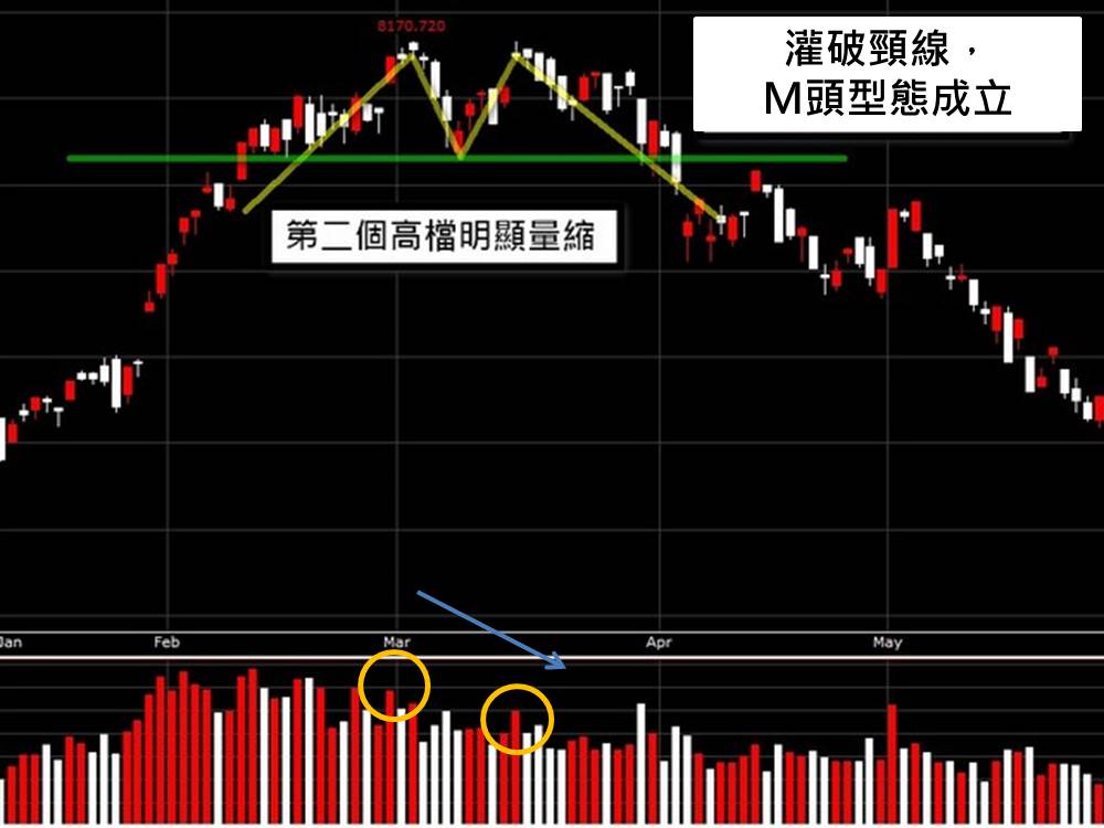 通常第二個高檔處,我們會確認當時量能的狀況,若持續出現量增的狀況,那麼創高的可能性較高;但如果出現明顯量縮的狀況代表的意義是第一次高點出現,拉回休息卻後繼無力反應在量能上,是指沒辦法有更強勁的續攻力道,難以有效突破上檔賣壓,通常會先回測頸線看是否有明顯支撐。回測頸線過後,若持續跌破,則我們確認M頭型態正式成立,此時可以做出賣出或是放空的操作。