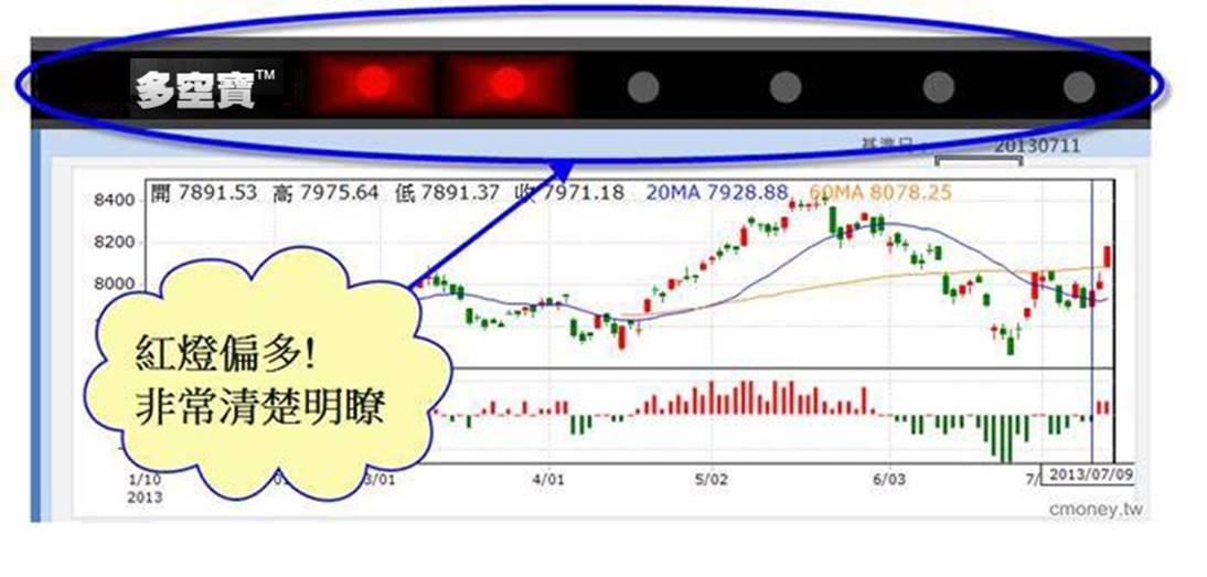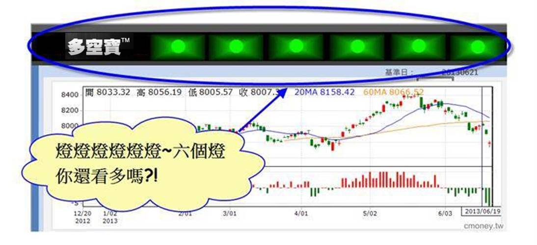 投資人每天只要打開多空寶,看到下圖的多空燈號,就能判斷目前大盤的多空狀況。