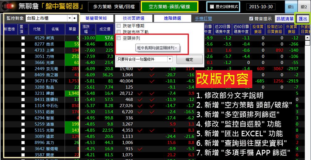 本次改版的重頭戲,增加 頭部成型 與 趨勢破線 兩大空方篩選,