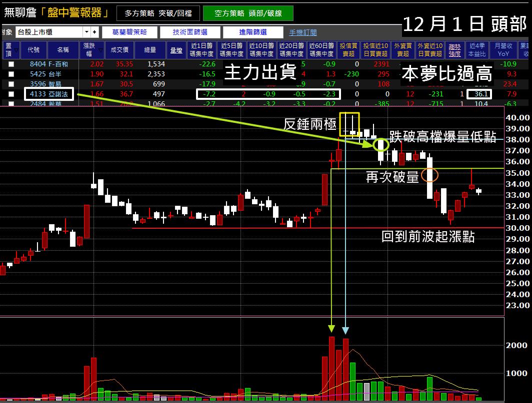 以 12/1 日盤中為例,頭部訊號會跳出 亞諾法(4133) 這檔個股