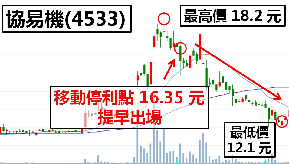 在股價跌至 16.35 元時,已達移動停利出場條件 獲利 27%
