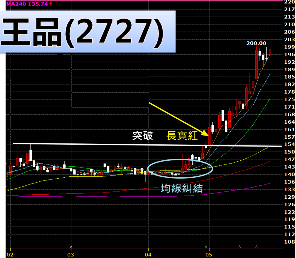王品(2727) 用日線圖對照 6 心法,糾結、突破、長實紅都相當符合