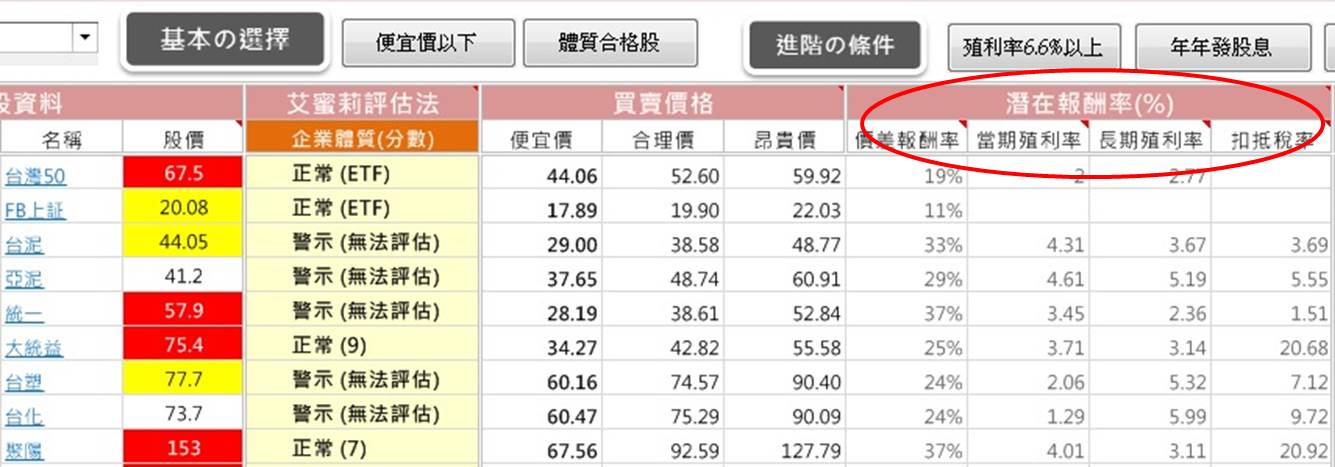「潛在報酬率」欄位的意義,讓我們在買進之前就可以大約估算可能能獲得的所有獲利!