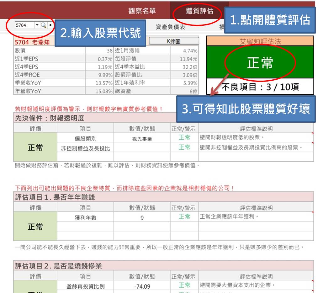 請點擊個股代號或名稱,就會跳到第二頁「體質評估」,