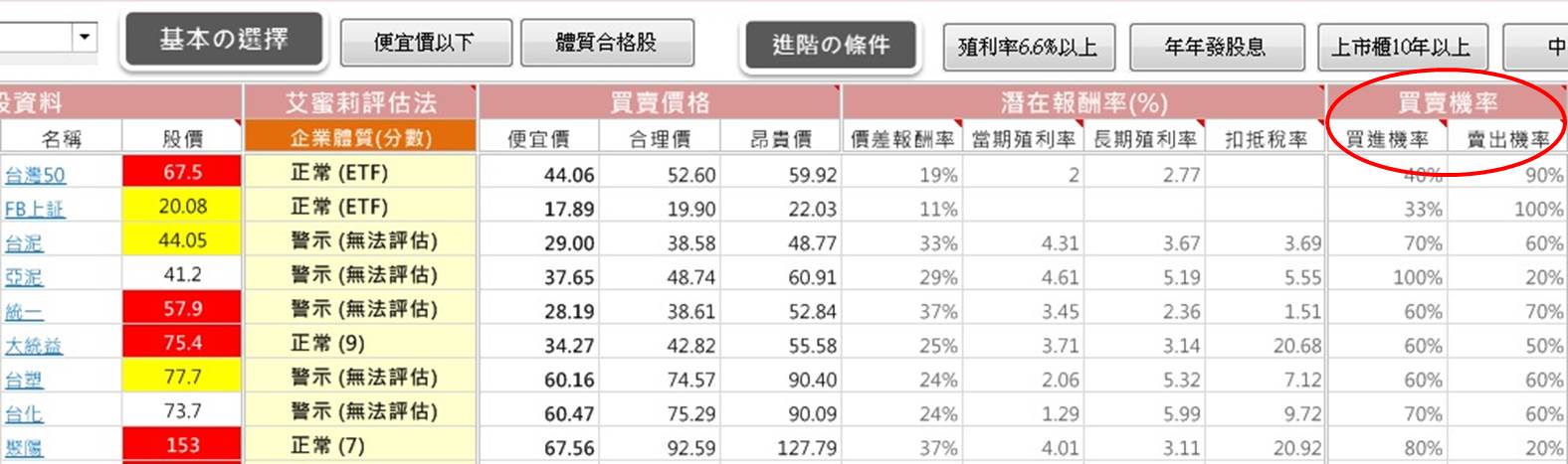 這是歷年可以用便宜價買進這檔股票的機率,和用合理價賣出這檔股票的機率。