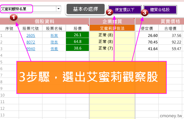 通常艾蜜莉會拿「艾蜜莉觀察名單」來篩選目前落到便宜價的個股