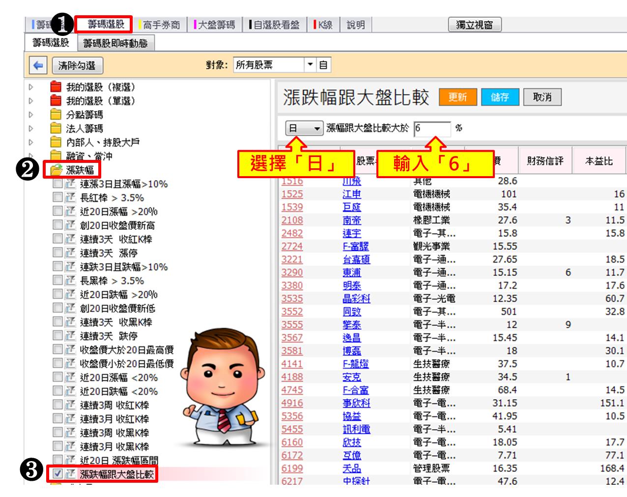 例如:我想找【單日個股漲幅>大盤 6%】的股票