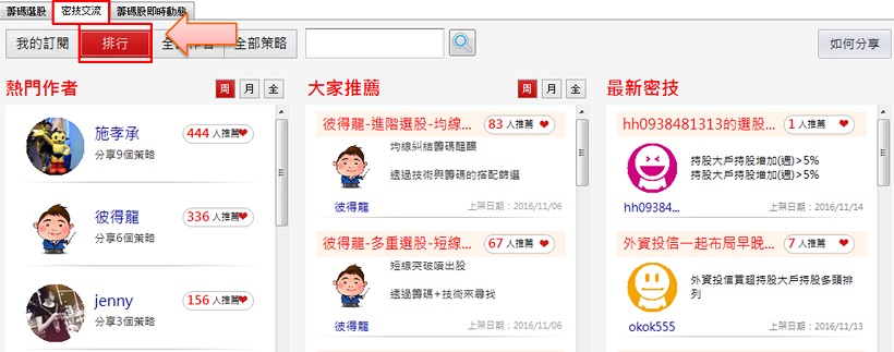 若剛開始投資不知道怎麼篩選,可以到「密技交流」看大家都怎麼做,從排行裡面會看到以下介面: