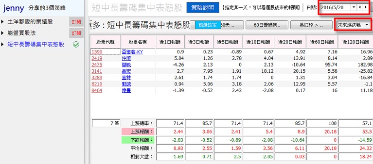 切換到「未來漲跌幅」和想要回測的日期,系統會直接幫我們篩選出當天符合條件的股票,下面還會自動統計告訴我們:後 1 日~後 240 日的上漲/下跌機率、平均報酬級相對大盤的表現,幫助大家判斷策略的好壞。