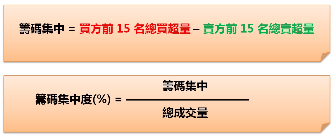 要看一檔股票的籌碼集中度,就是將「前 15 名買進券商的總買超量」扣掉「前 15 名賣出券商的總賣超量」,算出來若是正值,表示有人在吸收籌碼,所以只要挑出未來 1、5、20、60、120 日,籌碼集中度 > 0 的股票,就可以看出有主力在大量買進。