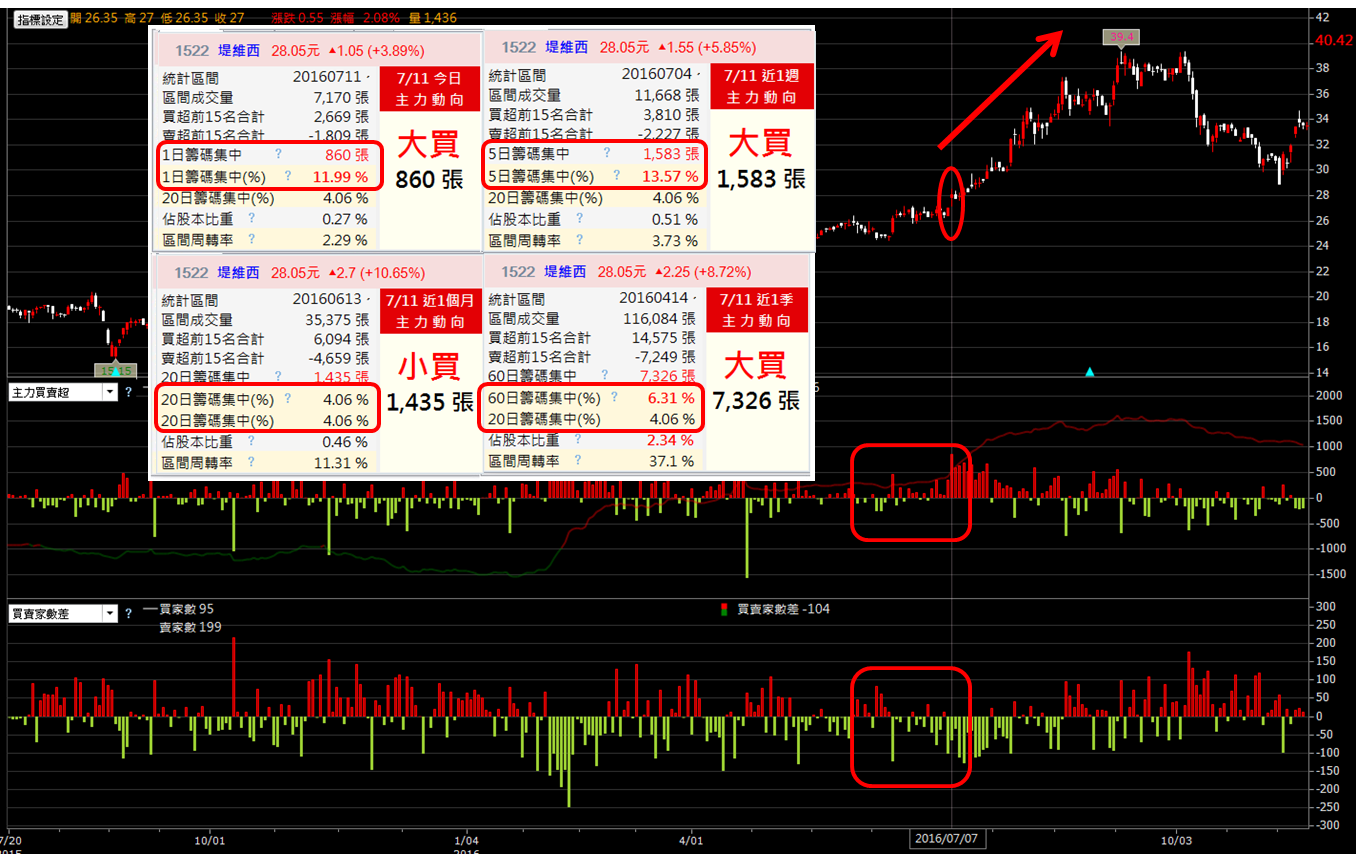 在 2016 / 7 / 11 挑出的這檔股票,過去 1 到 60 日籌碼集中度 在 4~13%,兩個月後股價漲 29%