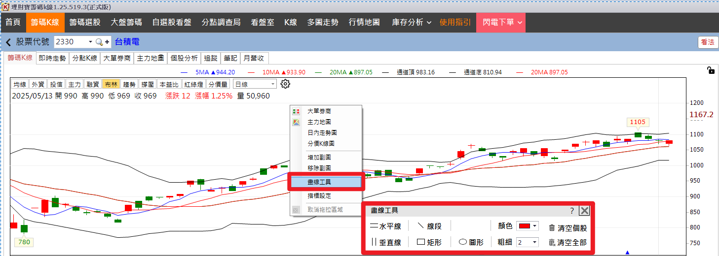 畫線工具 輔助思考,讓您分析更明確!技術分析中,趨勢線是不可或缺的判斷工具,您可以在 :【籌碼 K 線】任一處,點選滑鼠右鍵 叫出功能表,選擇【畫線工具】準備畫線囉!