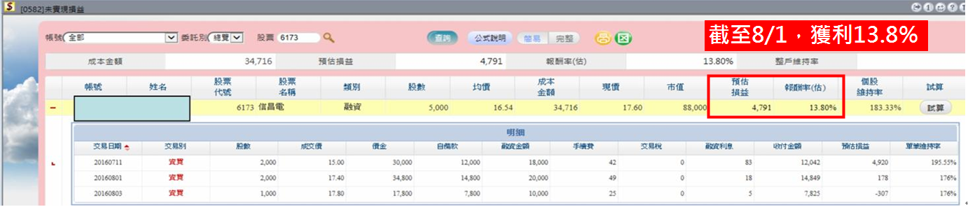 截止 8/1 帳上預估獲利 13.8% (融資)