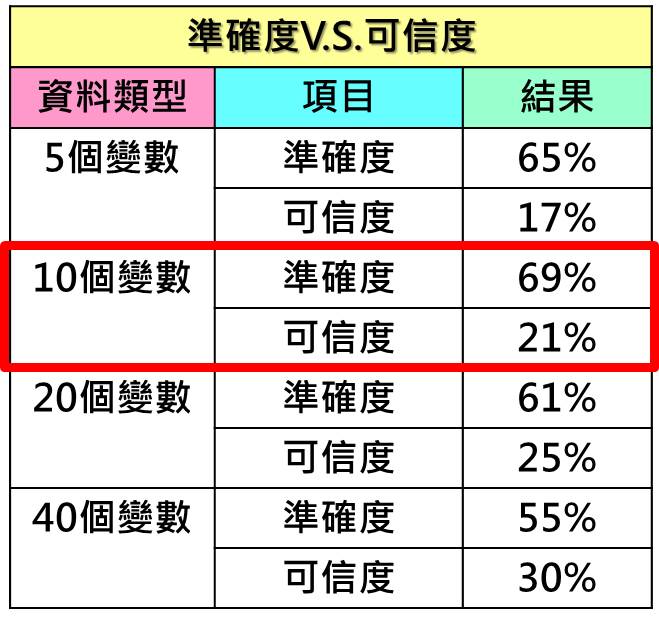 準確度和可信度均有提升,但變數持續增加時,
