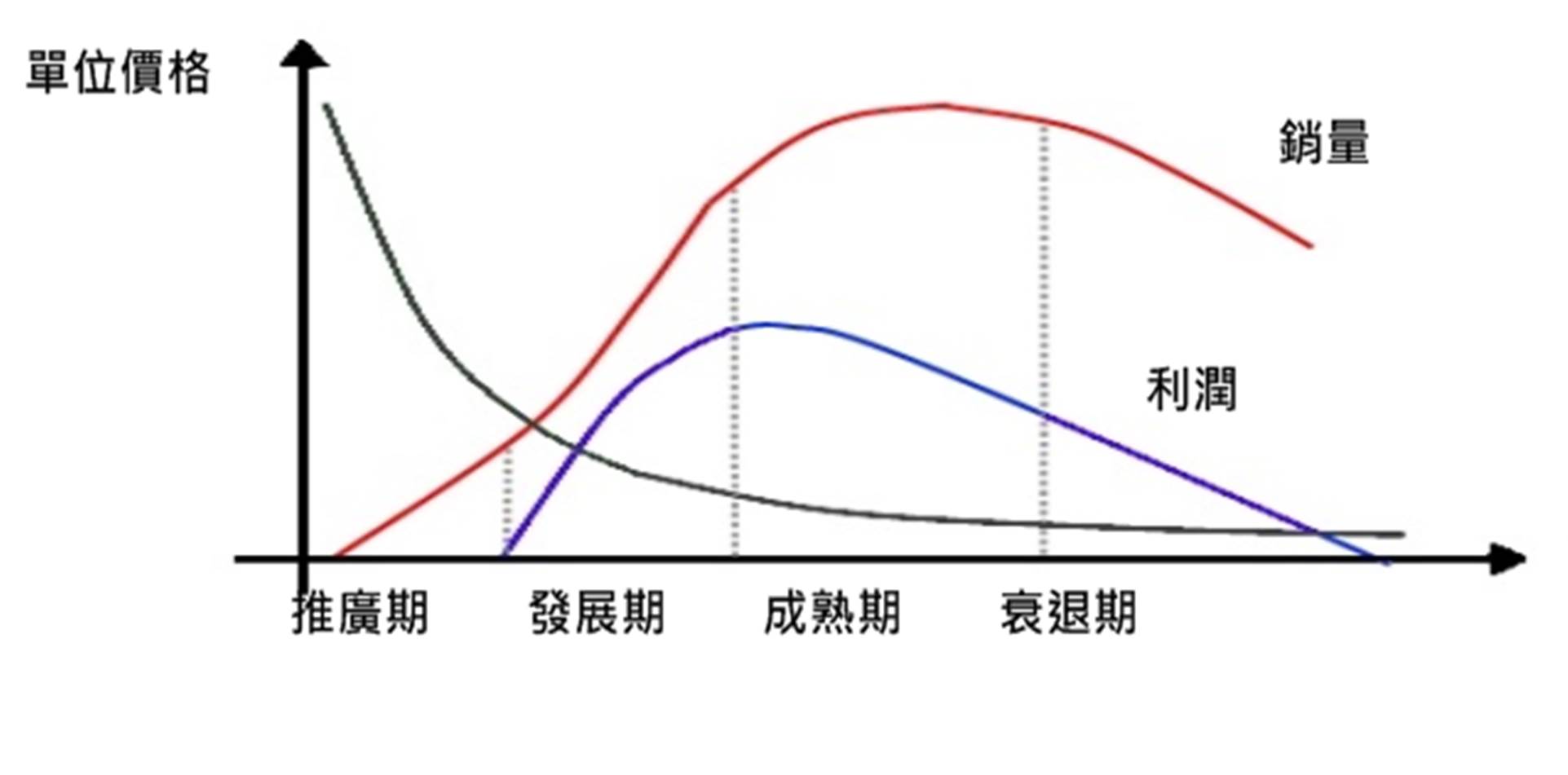 共有4個階段:推廣期、發展期、成熟期、衰退期。