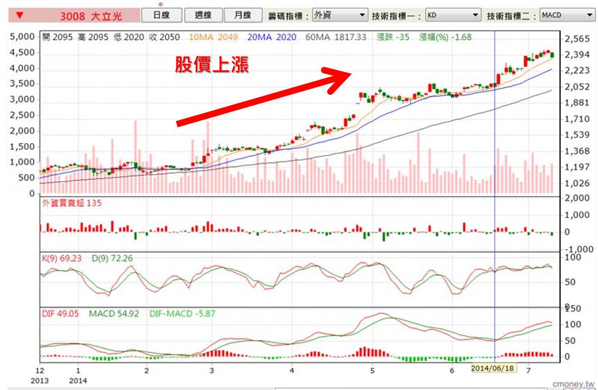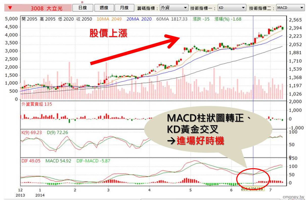 指標如2014/6/18 KD黃金交叉且MACD的柱狀體(OSC)由負轉正時,則是好時機。
